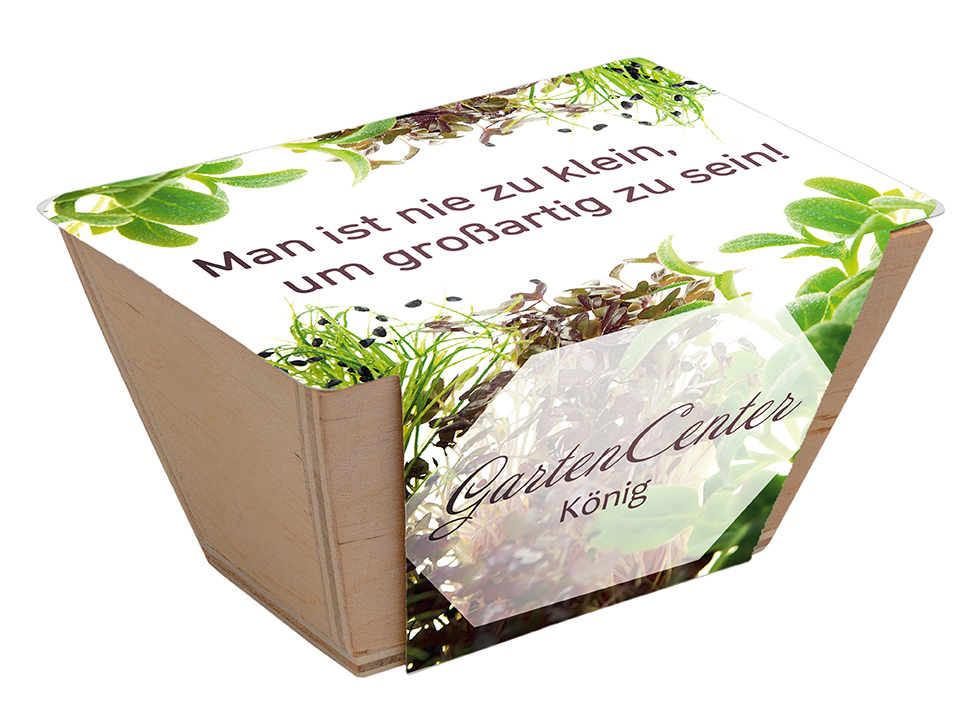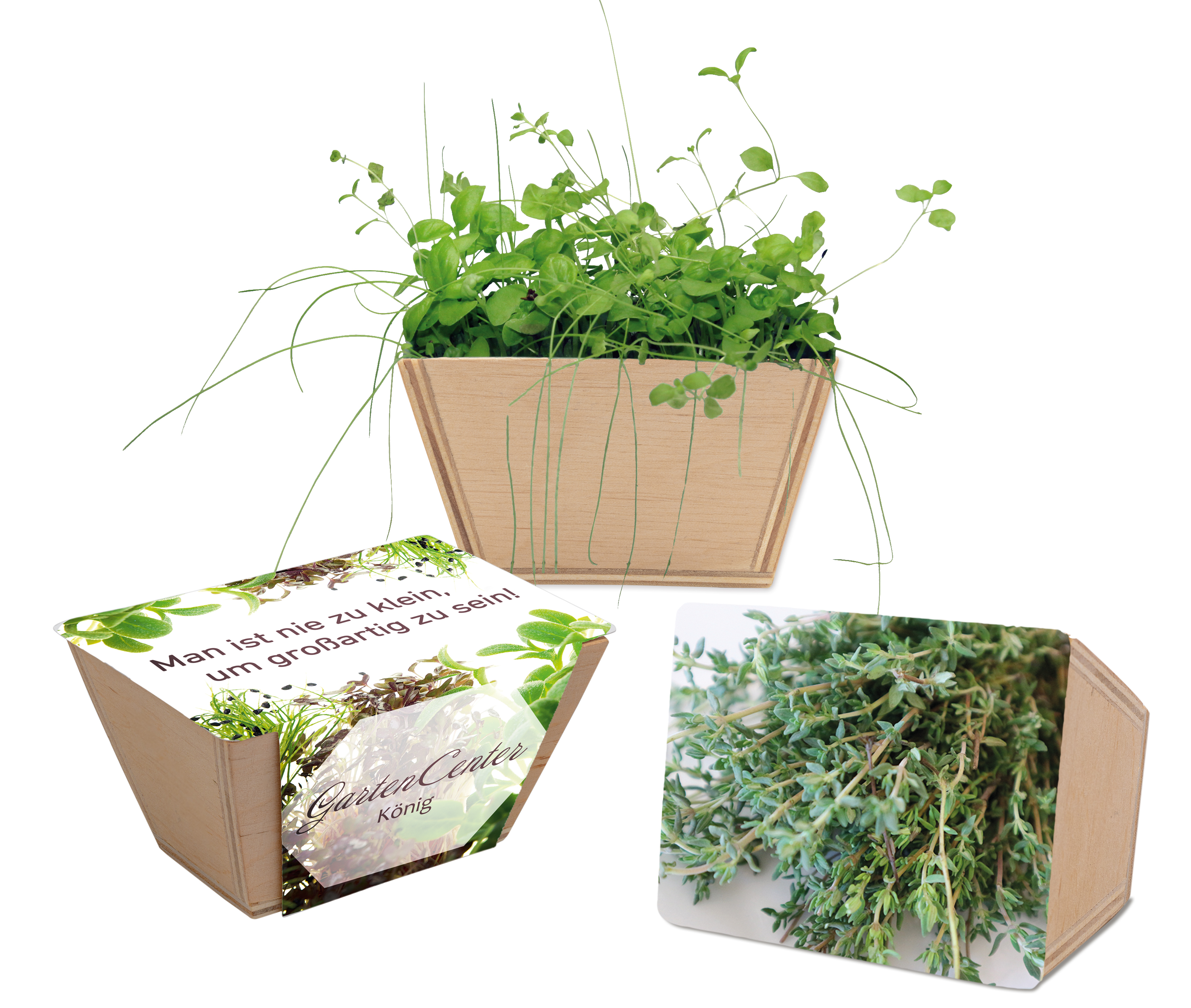 Das attraktive Blumenkästchen aus Holz im Bauernhof-Look enthält eine Substrattablette als Erde sowie eine Kräutersamen-Mischung (Basilikum, Majoran, Schnittlauch) oder Samen nach Wahl. Die Banderole aus Kartonbietet hier die optimale Werbefläche.