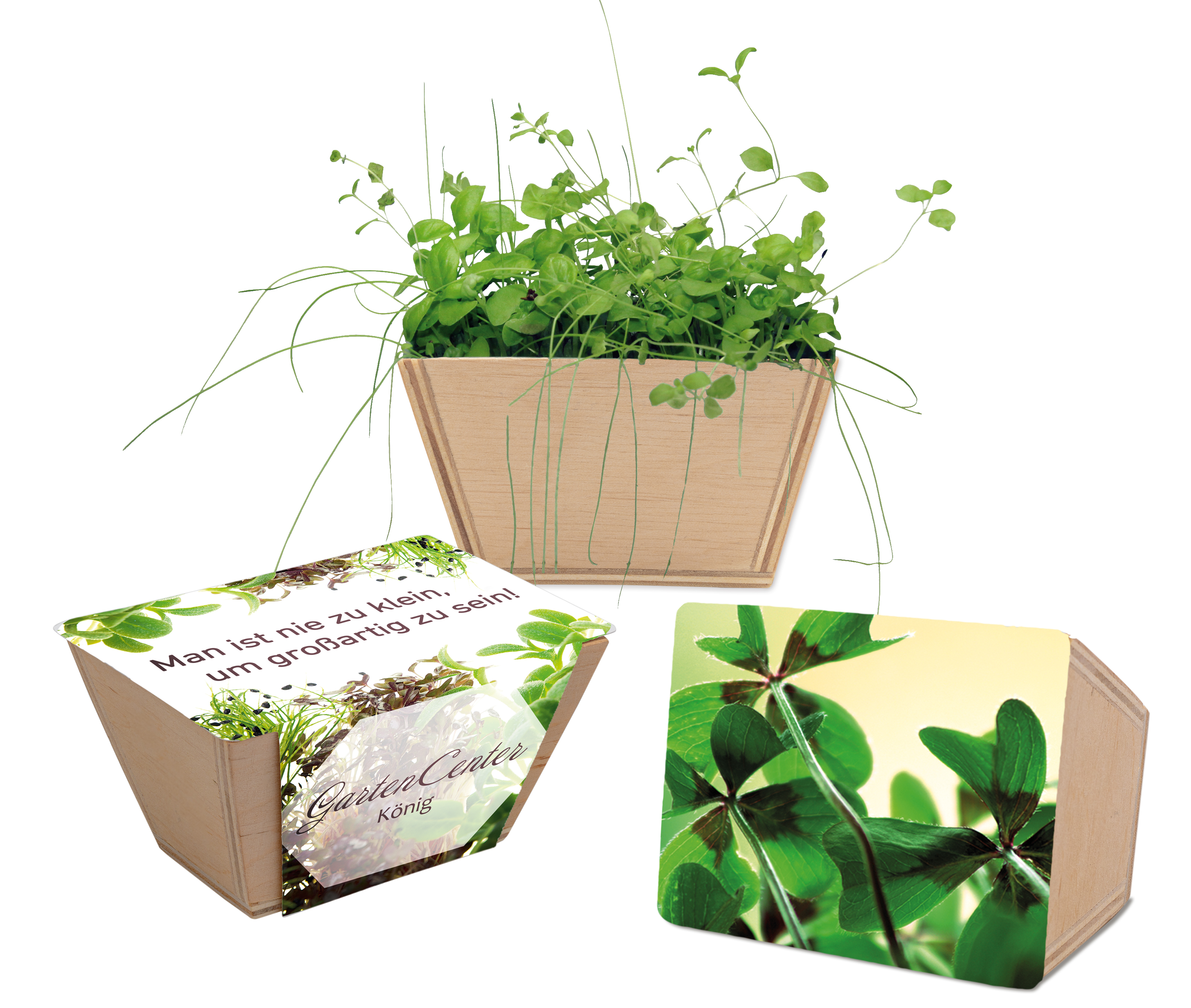 Das attraktive Blumenkästchen aus Holz im Bauernhof-Look enthält eine Substrattablette als Erde sowie eine Kräutersamen-Mischung (Basilikum, Majoran, Schnittlauch) oder Samen nach Wahl. Die Banderole aus Kartonbietet hier die optimale Werbefläche.