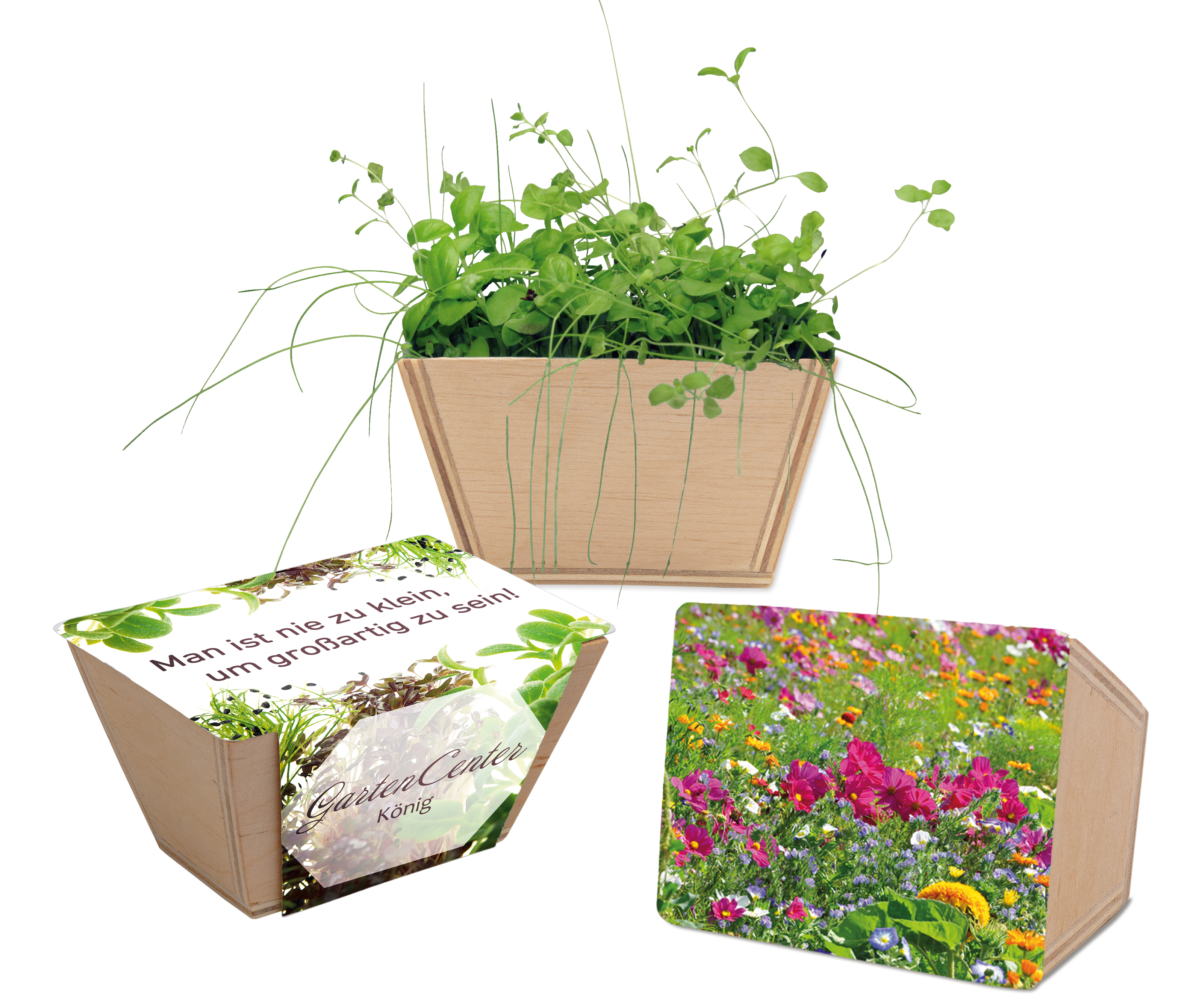 Das attraktive Blumenkästchen aus Holz im Bauernhof-Look enthält eine Substrattablette als Erde sowie eine Kräutersamen-Mischung (Basilikum, Majoran, Schnittlauch) oder Samen nach Wahl. Die Banderole aus Kartonbietet hier die optimale Werbefläche.