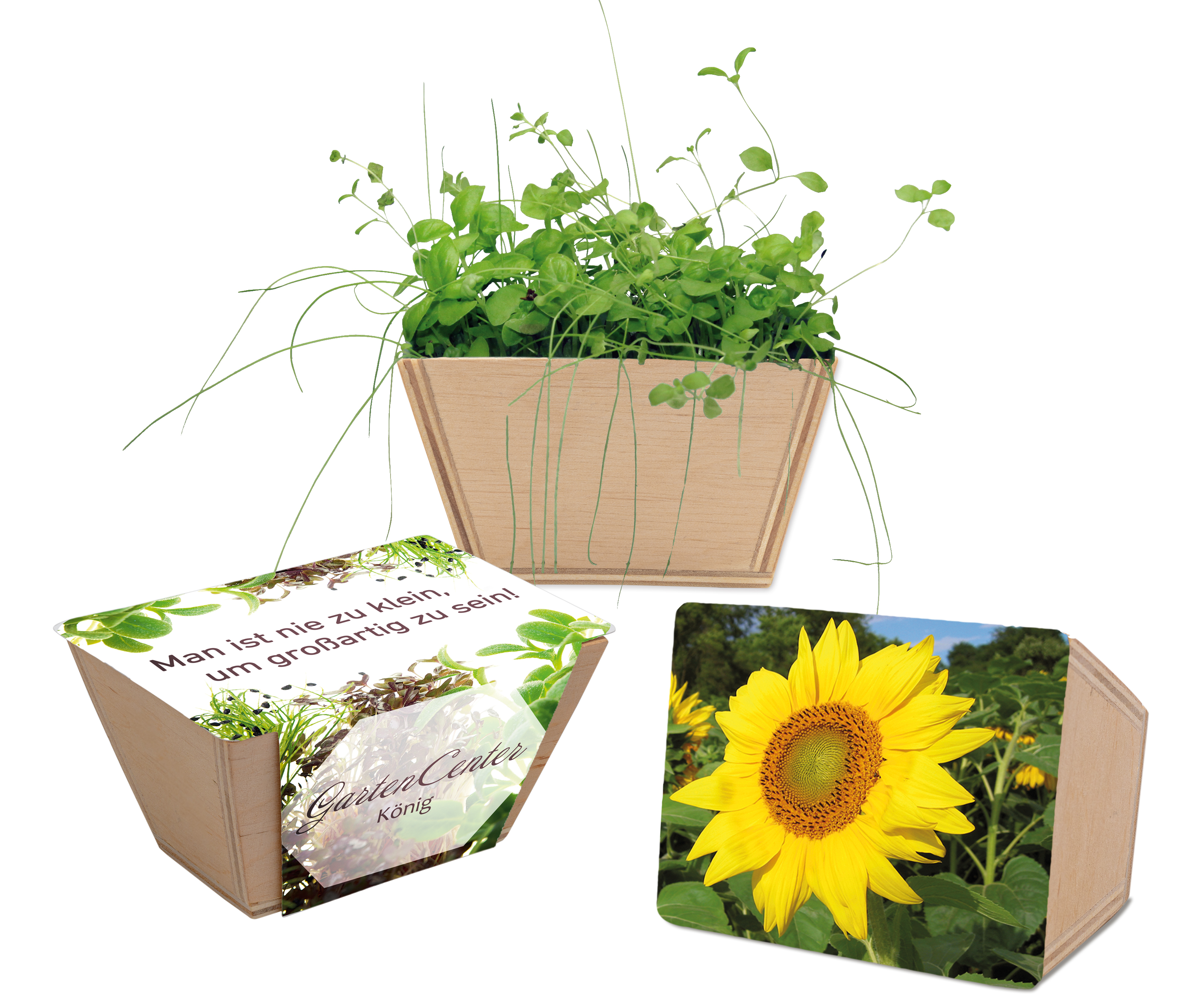Das attraktive Blumenkästchen aus Holz im Bauernhof-Look enthält eine Substrattablette als Erde sowie eine Kräutersamen-Mischung (Basilikum, Majoran, Schnittlauch) oder Samen nach Wahl. Die Banderole aus Kartonbietet hier die optimale Werbefläche.