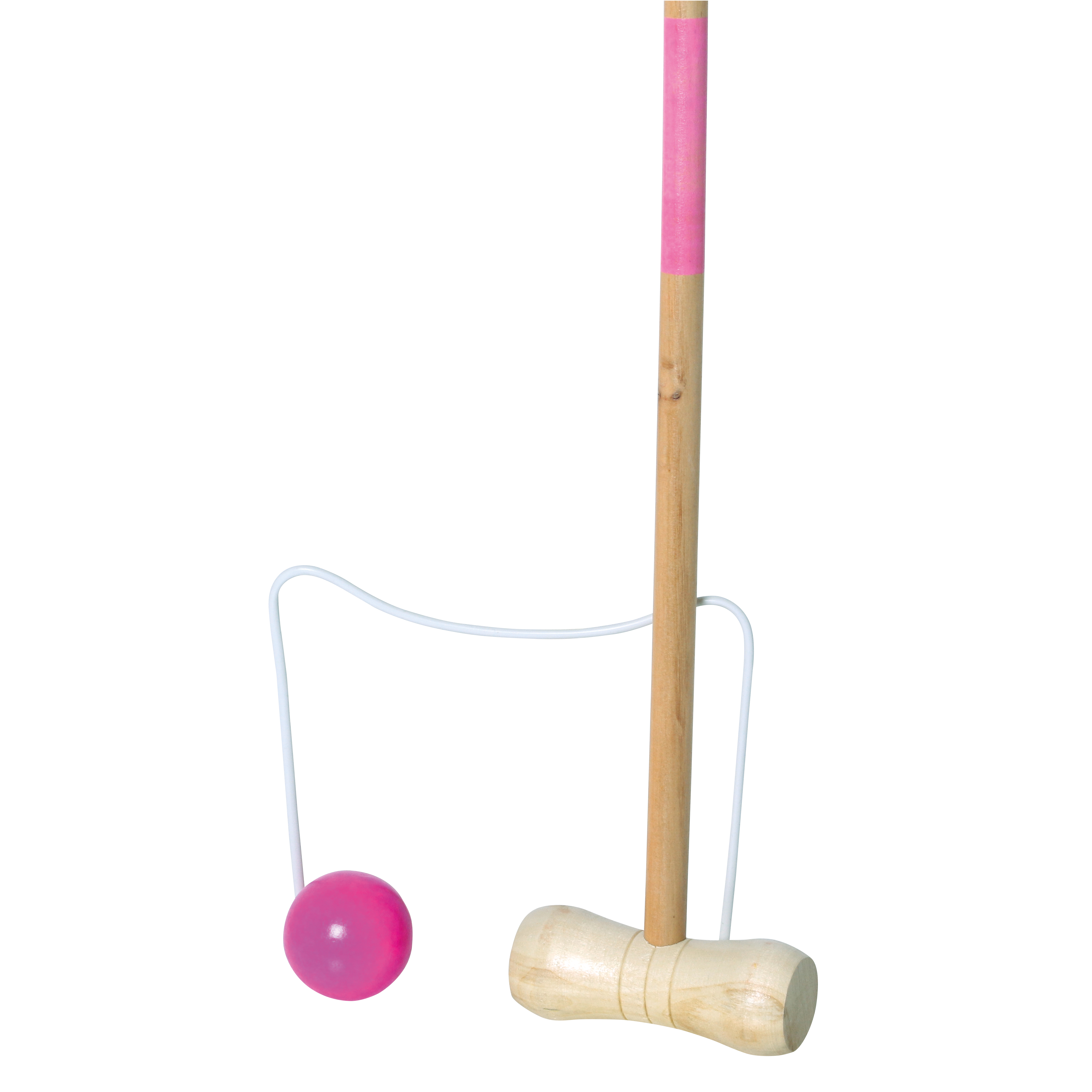 Massive Ausführung aus Holz. Für maximal vier Spieler. Inhalt: 4 Schläger (Länge 57 cm), 4 Kugeln (Durchmesser 4,4 cm), 9 Tore aus Metall, 2 Start- / Zielpfosten - im Netzbeutel.