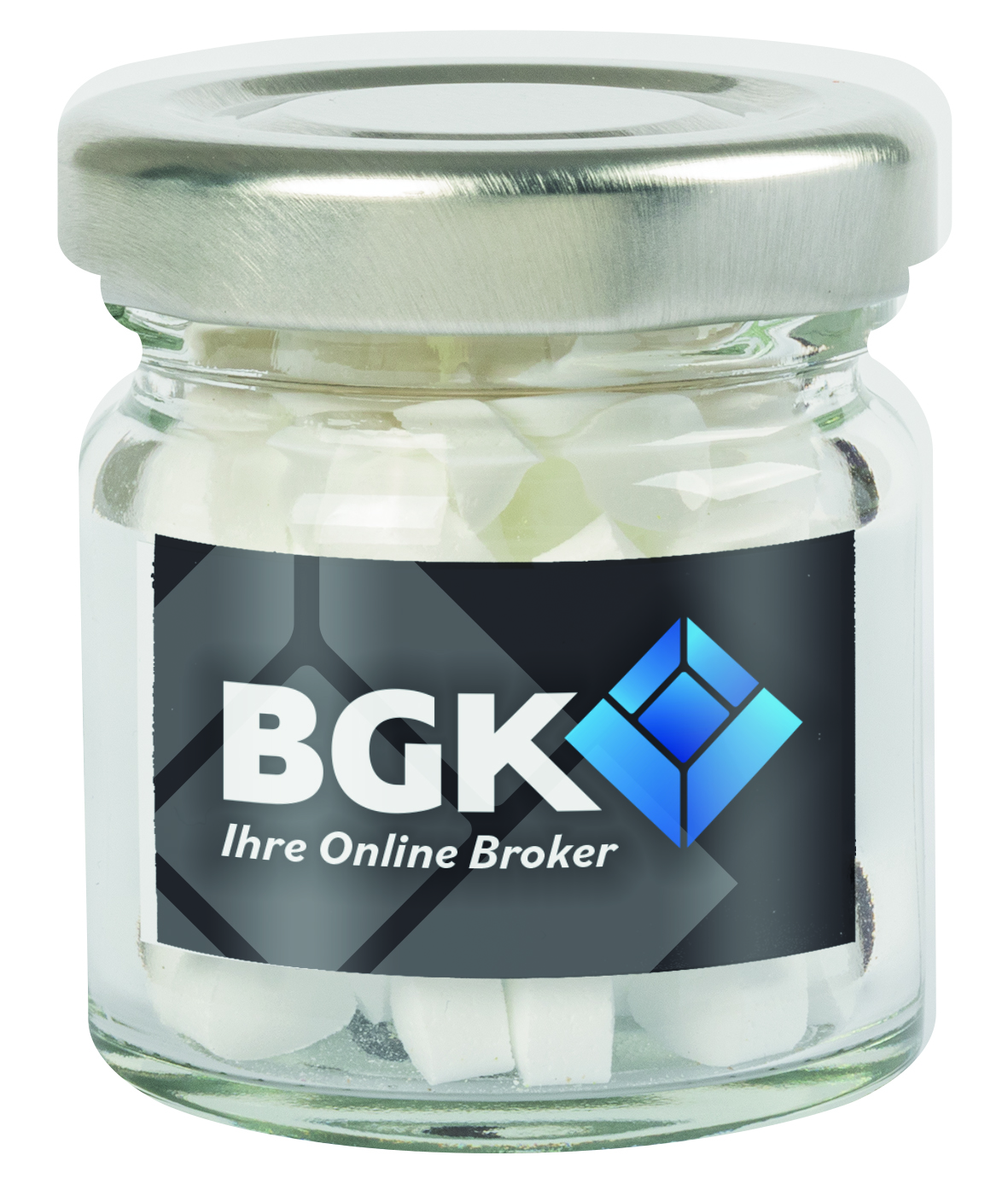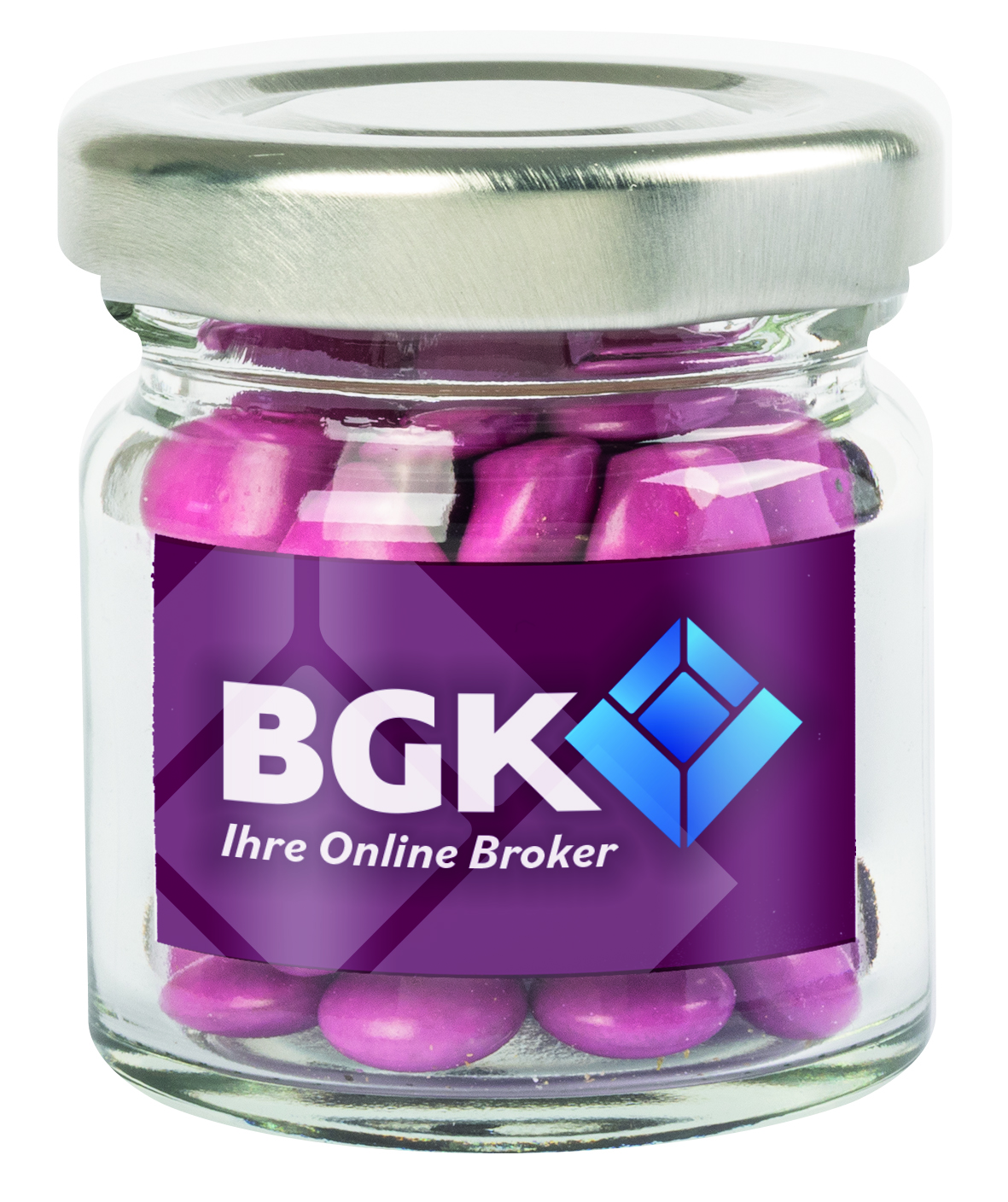 "Süße" kleine Gläschen mit silbernem Schraubdeckel und individuellem 4c-Etikett - gefüllt mit süßen Kleinigkeiten, z. B. Schoko-Linsen in Ihren Logofarben. Ein Hingucker in weiterverwendbaren Gläschen. Inhalt: max. 30 g je nach Füllsorte. Mögliche Füllungen: Traubenzucker-Pastillen, Salmiak-Splitter, Mint-Pastillen zuckerfrei, Schoko-Konfetti, Schoko-Linsen in schwarz, weiß, gelb, orange, rot. pink, lila, grün, türkis oder blau. Druckvorkosten inklusive.