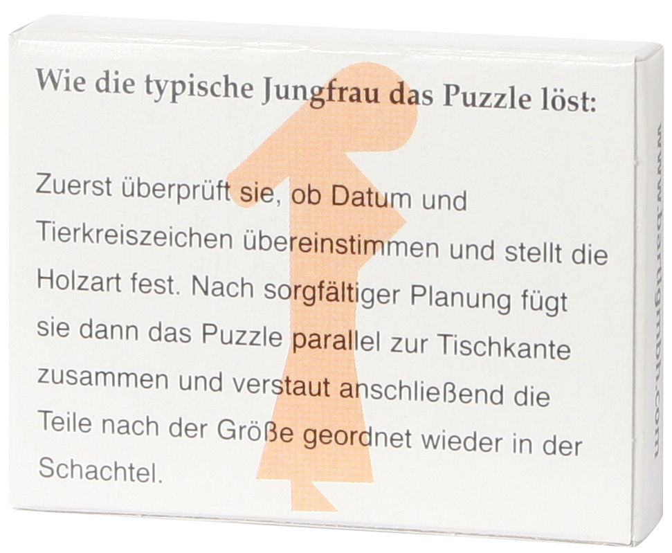 Verzwicktes Holz-Legepuzzle für Ihr Sternzeichen - auf der Schachtelrückseite ist lustig beschrieben, wie jeder Sternzeichen-Typ seine Aufgabe lösen wird! Sieben Teile!