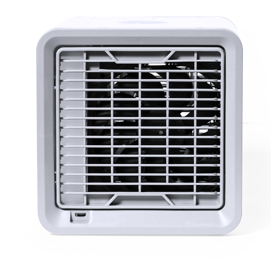 Tragbares Mini-Klimagerät zum Kühlen und Reinigen der Luft. Klein und leicht, einfach zu transportieren. Ventilator mit drei Geschwindigkeitsstufen (hoch, mittel, niedrig). Einschließlich eines Wassertanks mit großer Kapazität -700 ml-, mit der Möglichkeit, Eiswürfel für eine kühlere Luftumgebung hinzuzufügen. Der Ventilator wird über ein USB-Netzkabel (im Lieferumfang enthalten) an das Stromnetz angeschlossen und wird einzeln verpackt in einer Kraft-Design-Box geliefert. Die Bedienungsanleitung ist in Englisch und Spanisch erhältlich.