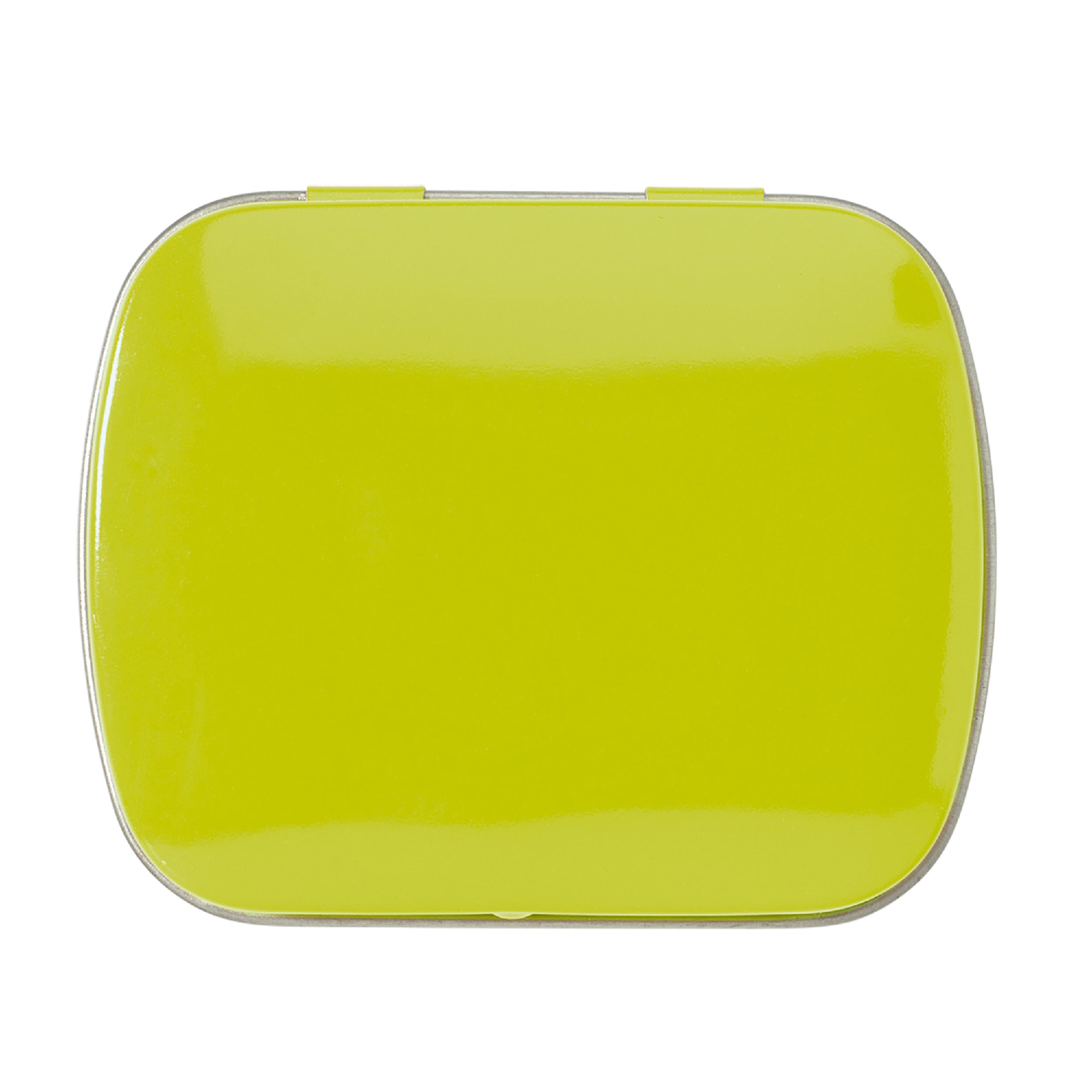 Quadratische Pfefferminzdose, gefüllt mit 23g holländischer Pfefferminzbonbons. Nicht zuckerfrei.