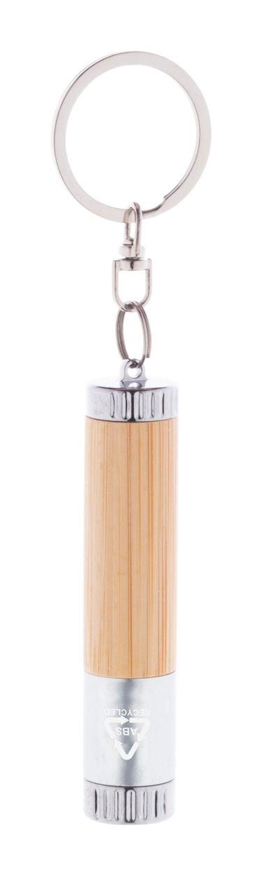 Mini-Taschenlampe aus Bambus und recyceltem ABS Kunststoff mit 1 LED und Metallschlüsselring. Inkl. Knopfzellenbatterie.