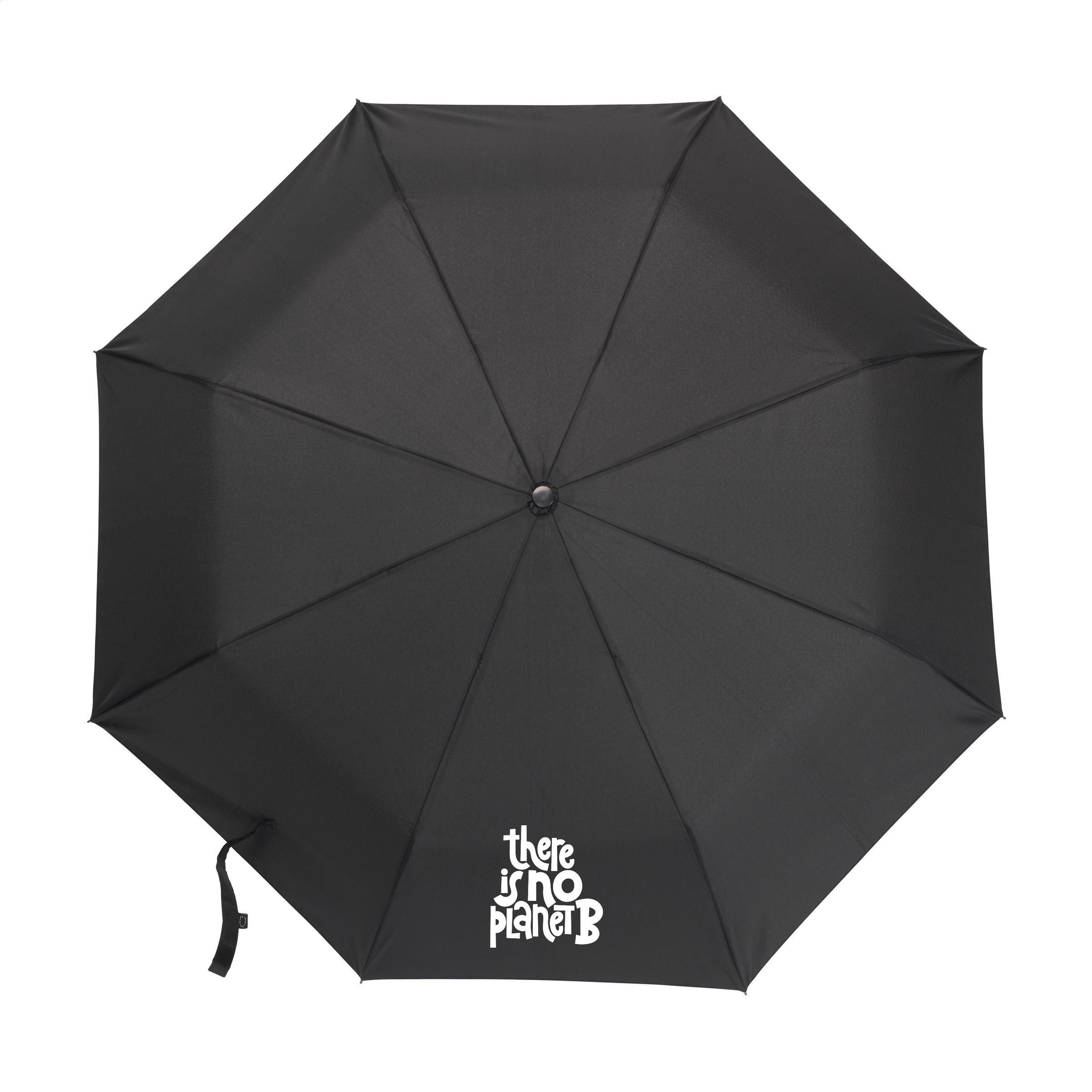 Faltbarer Regenschirm mit 190T RPET Pongee Polyester-Bezug. Mit mit einem Schaft und einem Gestell aus Edelstahl, einem Bambusgriff mit Baumwollschlaufe, Klettverschluss, Aufbewahrungshülle und RPET-Etikett. Manuelle Bedienung. RCS-zertifiziert. Recyceltes Material insgesamt: 18%.