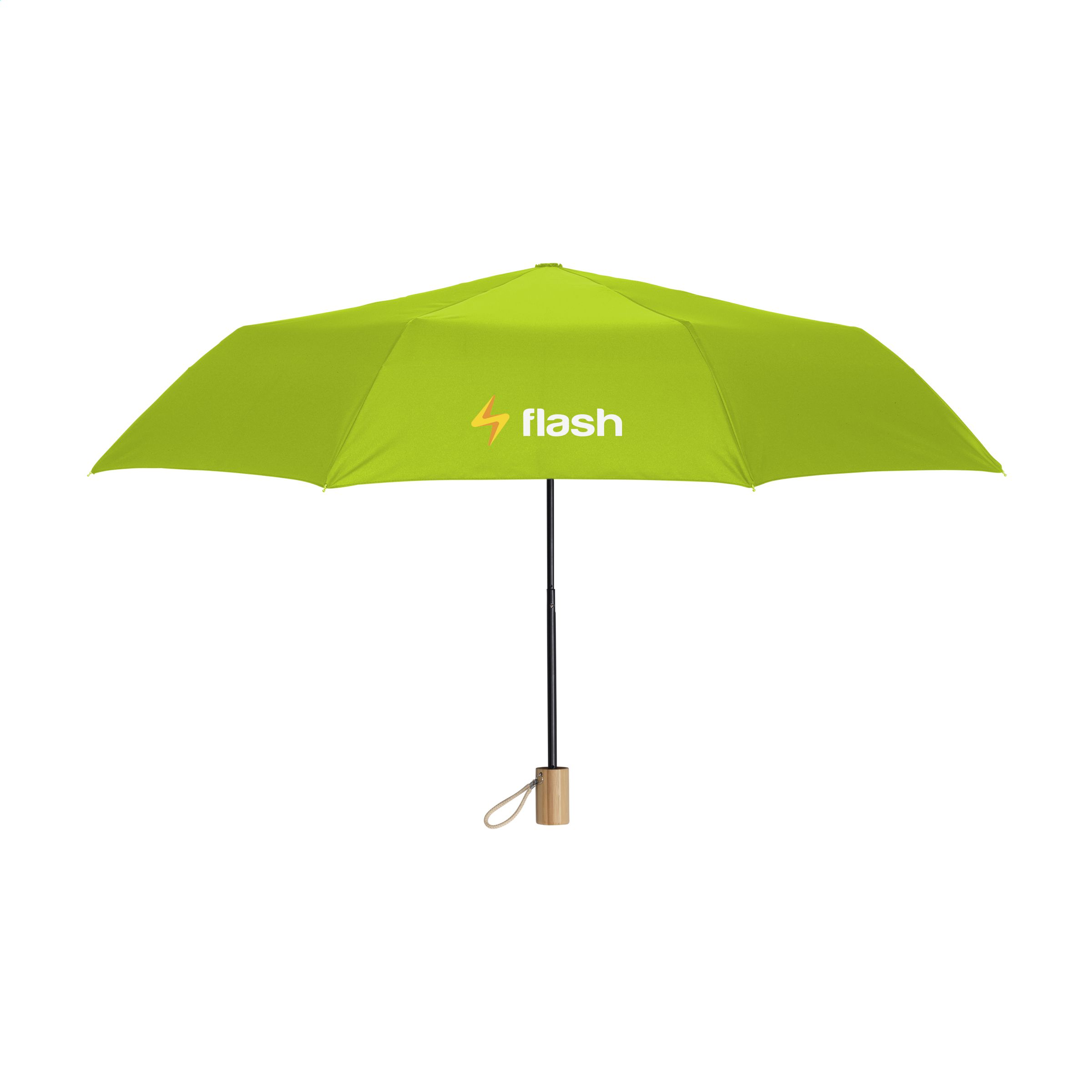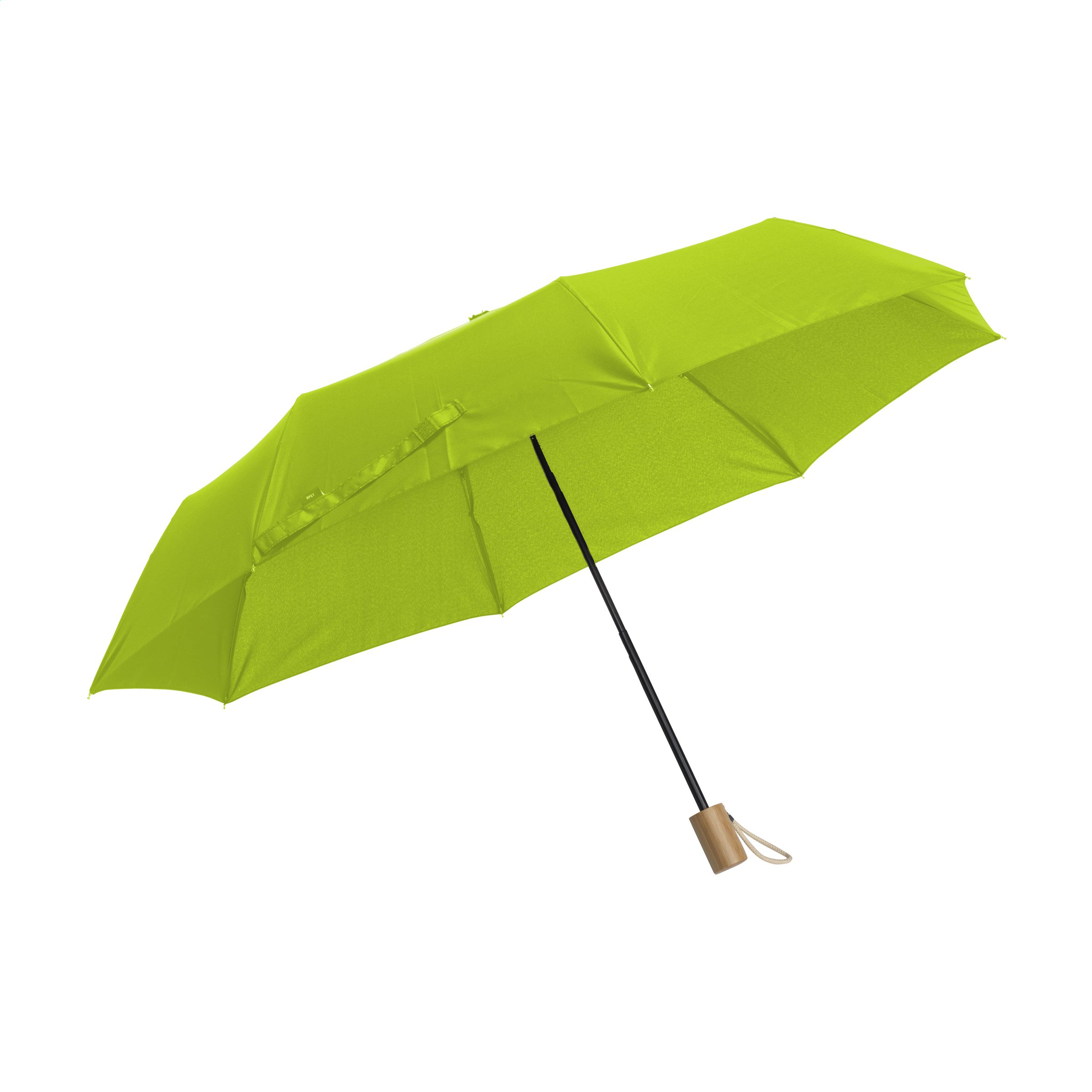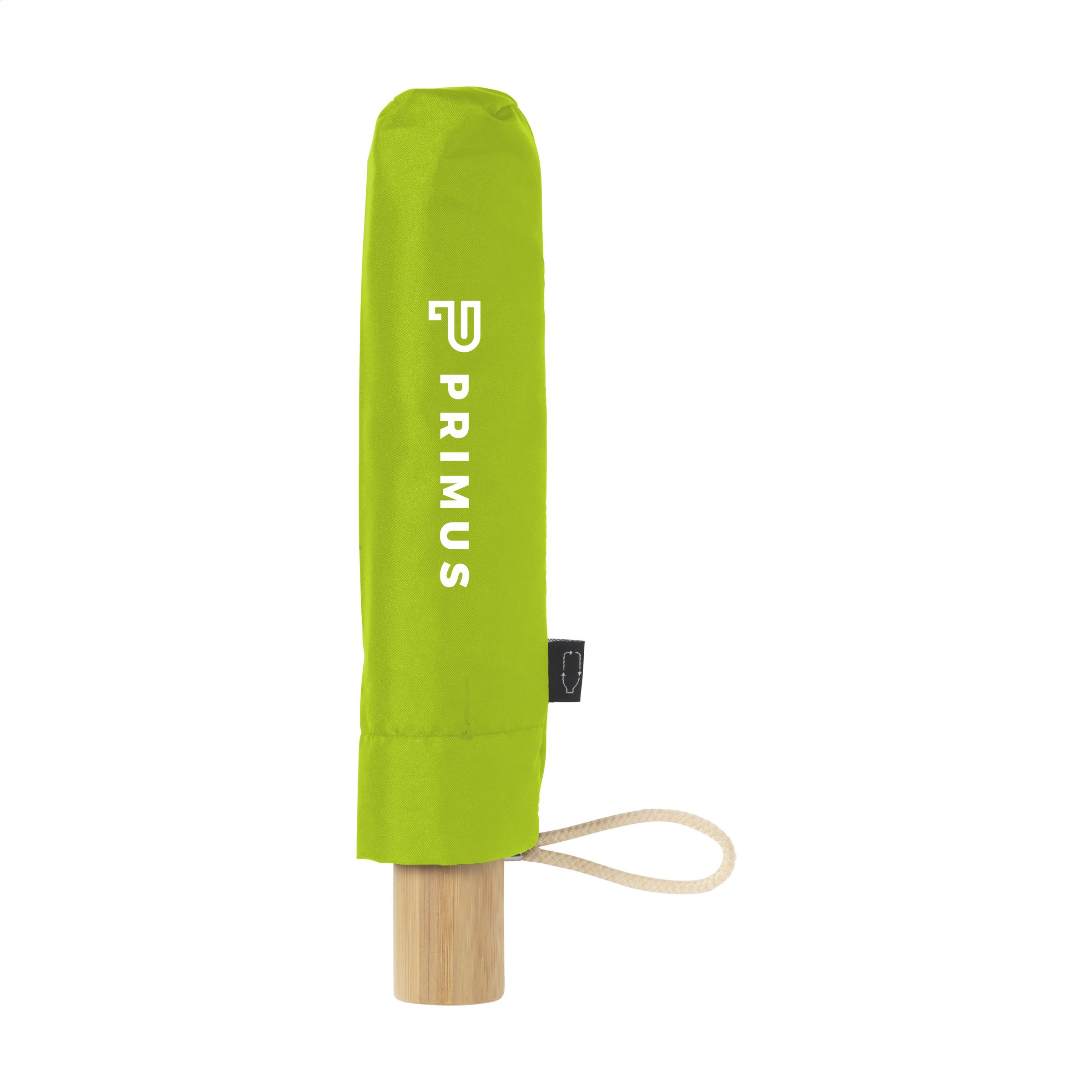 WoW! Faltbarer Regenschirm mit 190T RPET Pongee Polyester-Bezug. Mit mit einem Schaft und einem Gestell aus Edelstahl, einem Bambusgriff mit Baumwollschlaufe, Klettverschluss, Aufbewahrungshülle und RPET-Etikett. Manuelle Bedienung. RCS-zertifiziert. Recyceltes Material insgesamt: 18%.