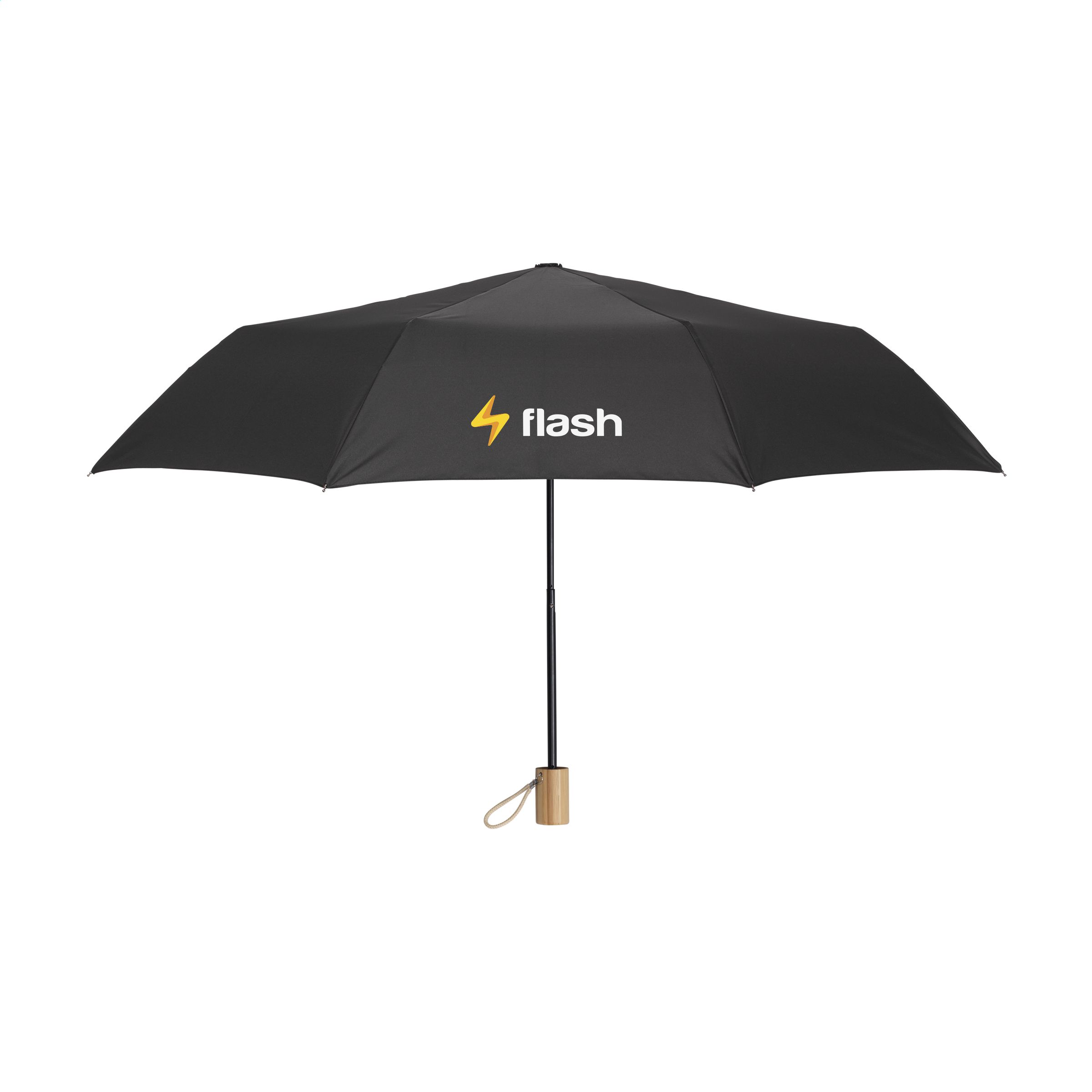 WoW! Faltbarer Regenschirm mit 190T RPET Pongee Polyester-Bezug. Mit mit einem Schaft und einem Gestell aus Edelstahl, einem Bambusgriff mit Baumwollschlaufe, Klettverschluss, Aufbewahrungshülle und RPET-Etikett. Manuelle Bedienung. RCS-zertifiziert. Recyceltes Material insgesamt: 18%.