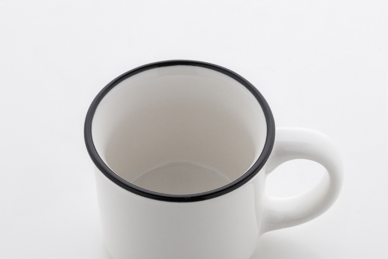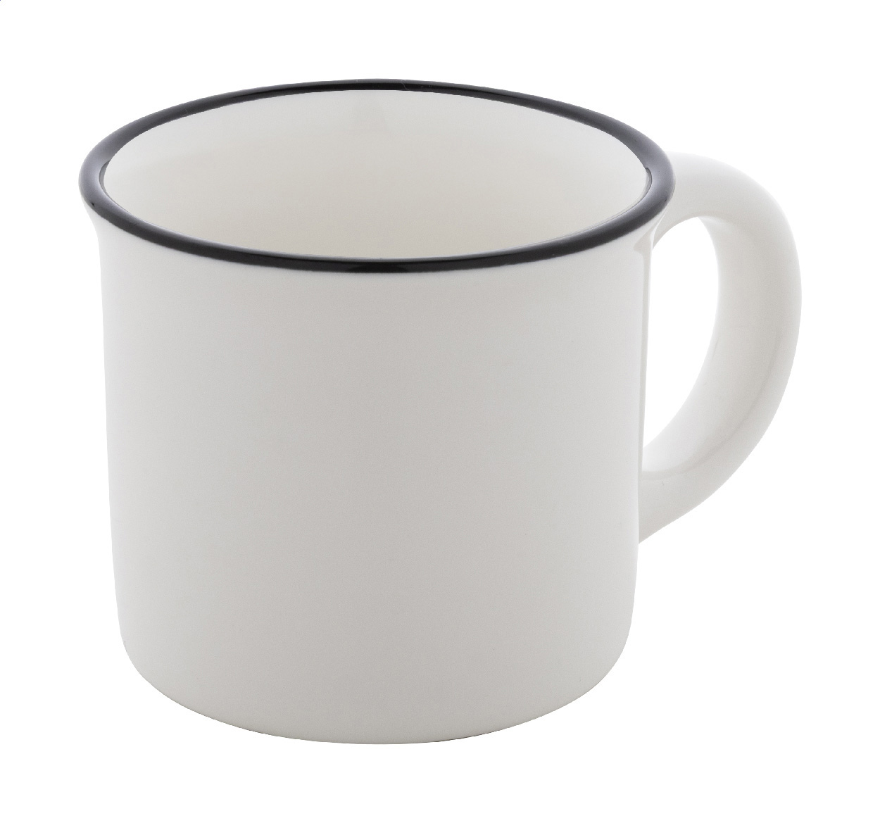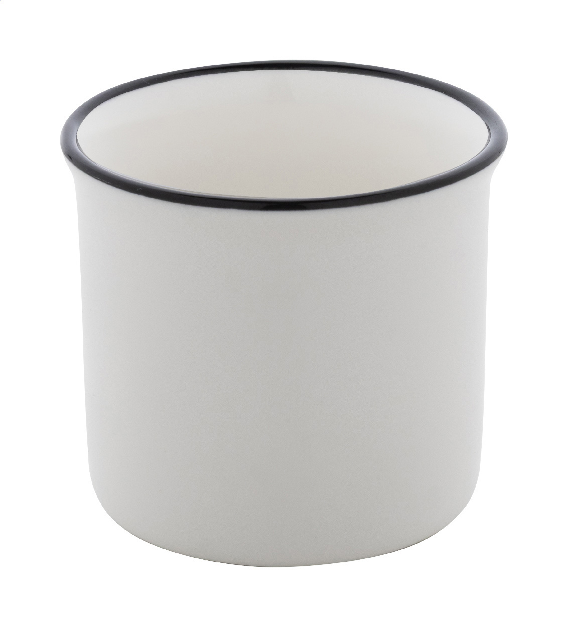 Mini-Vintage-Keramikbecher mit schwarzem Rand, innen weiß und außen farbig. Füllmenge: 90 ml. Einzeln in Kraftpapierbox.