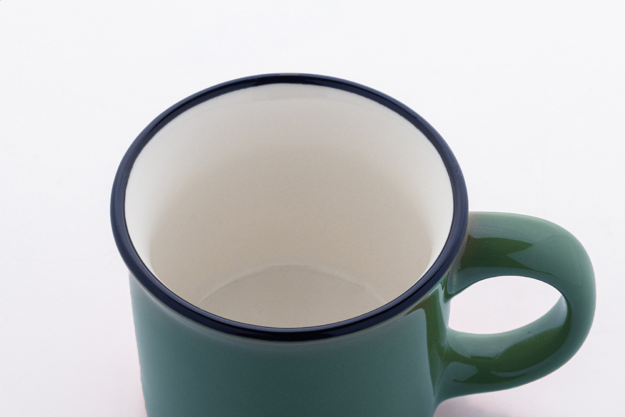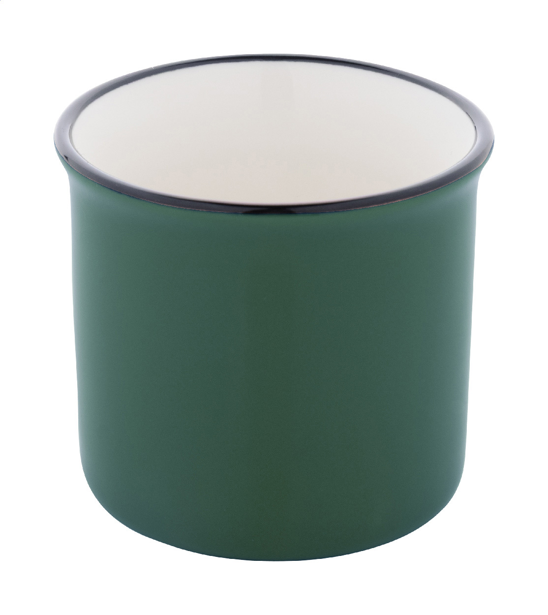 Mini-Vintage-Keramikbecher mit schwarzem Rand, innen weiß und außen farbig. Füllmenge: 90 ml. Einzeln in Kraftpapierbox.