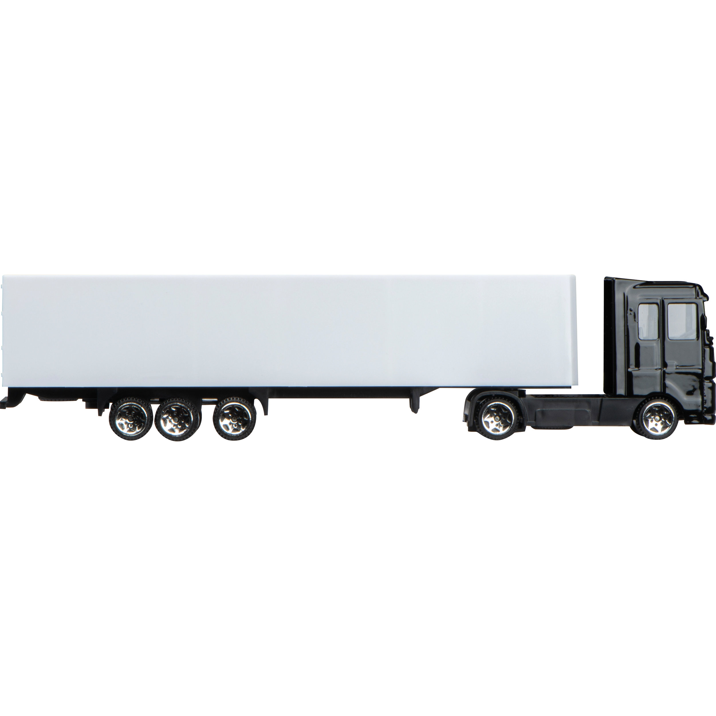 Miniatur LKW mit Fahrerkabine aus Metall und Auflieger aus Kunststoff. Die weiße Fläche des Anhängers eignet sich hervorragend für einen vollflächigen Digitaldruck.