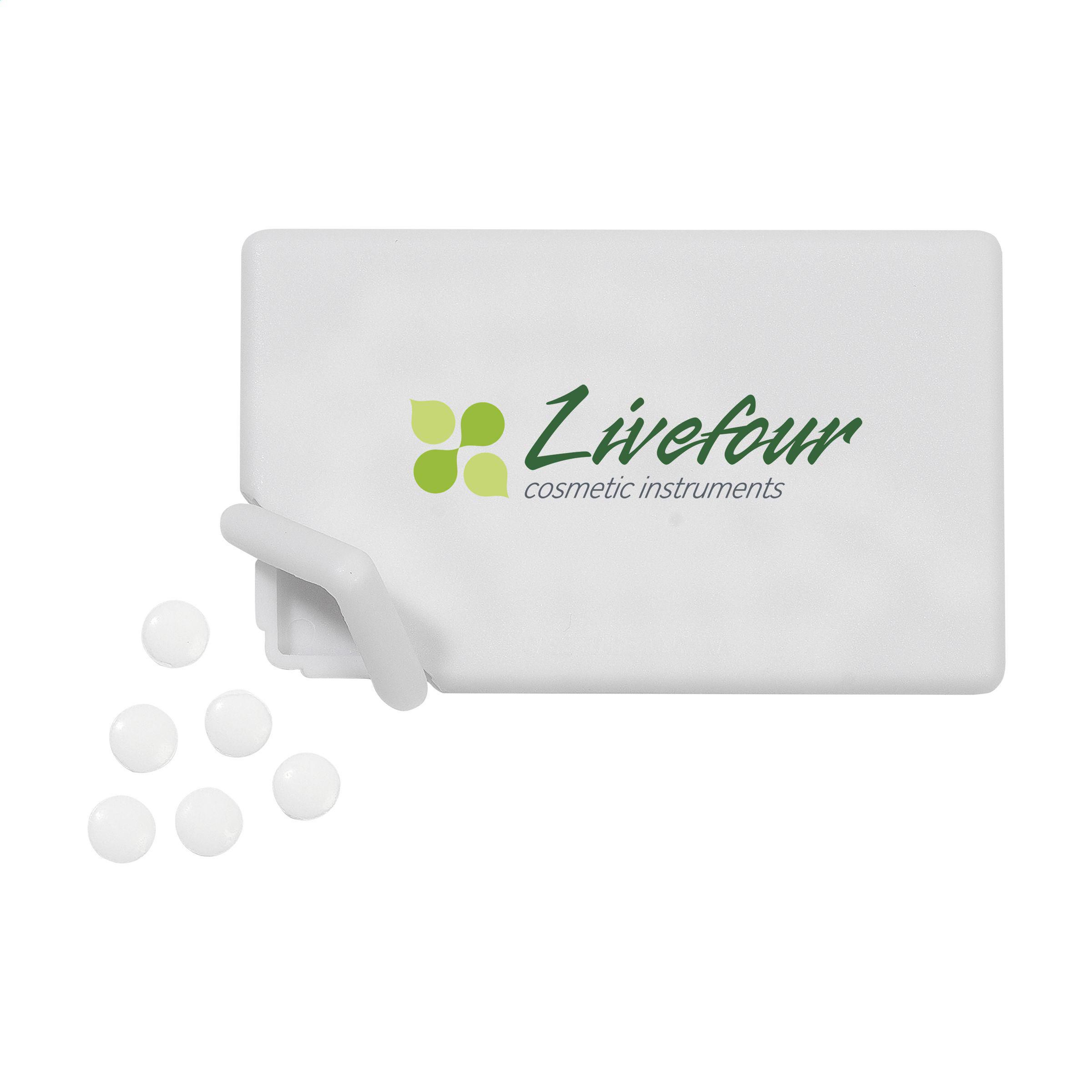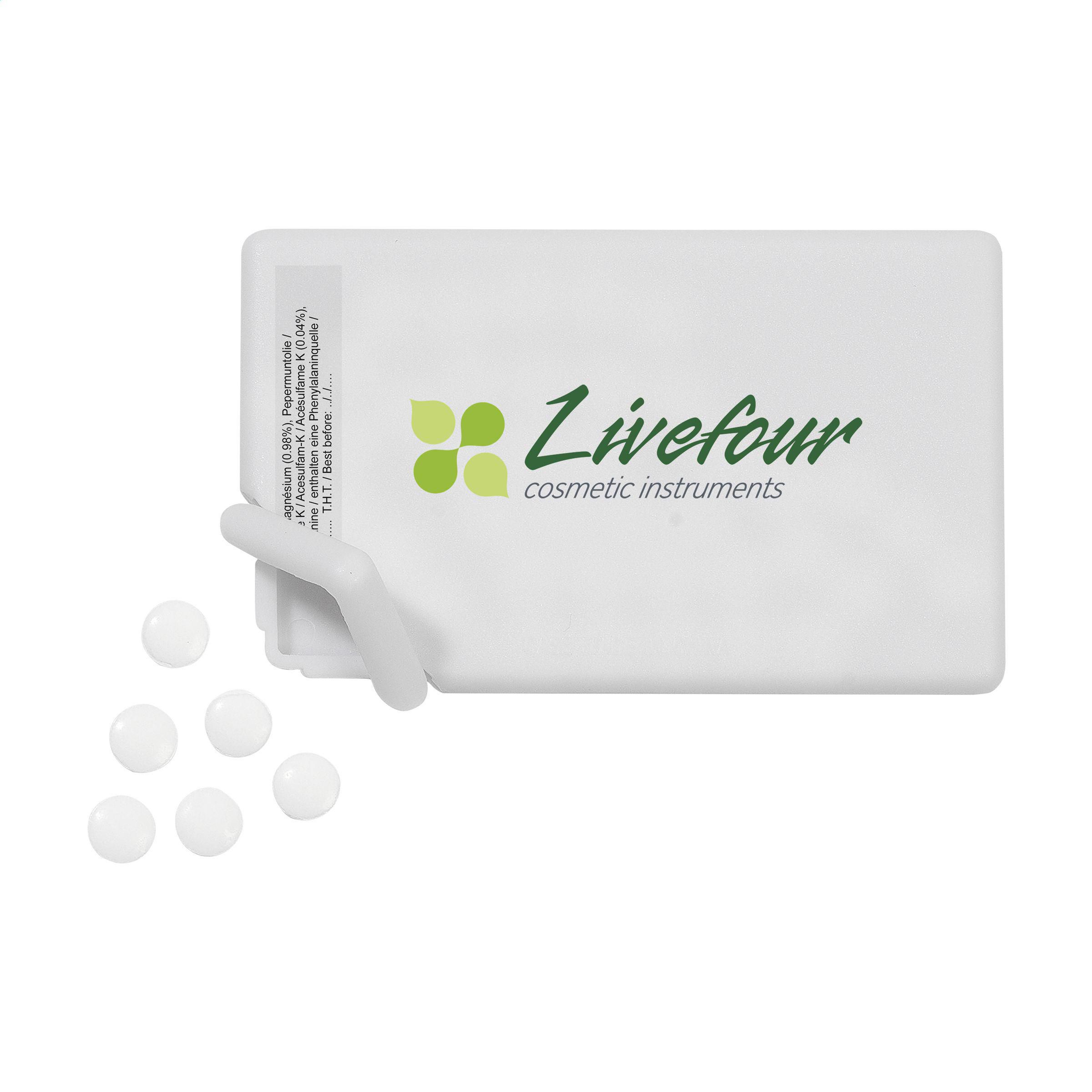 Spender mit ca. 8 g (50 Stück) zuckerfreien Pfefferminzpastillen.