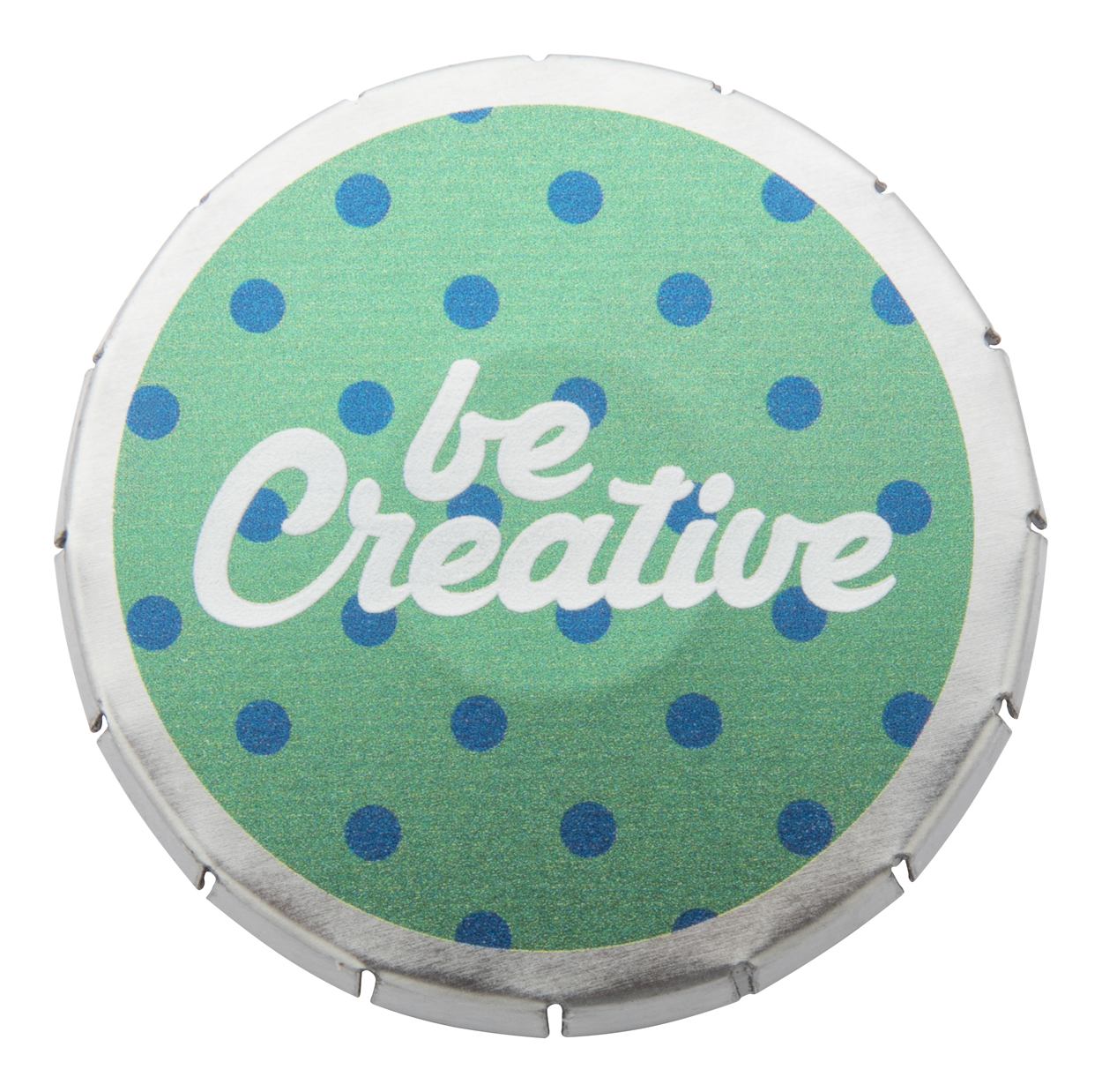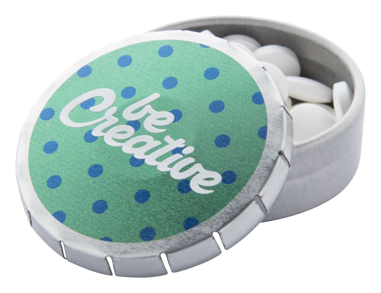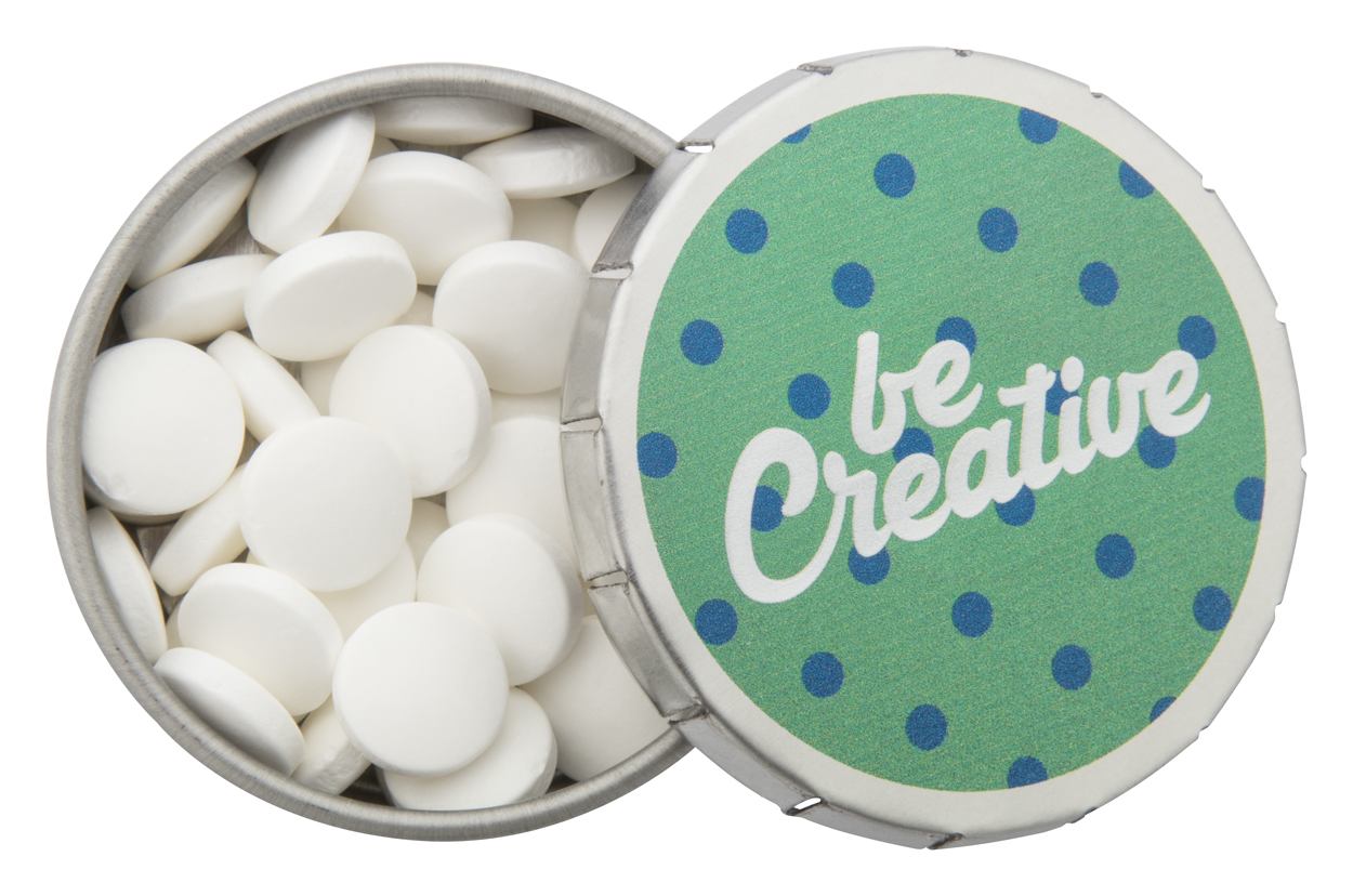 Runde Minzdose aus Metall mit ca. 12 g Minzbonbons. Kann durch Drücken des Deckels geöffnet werden.