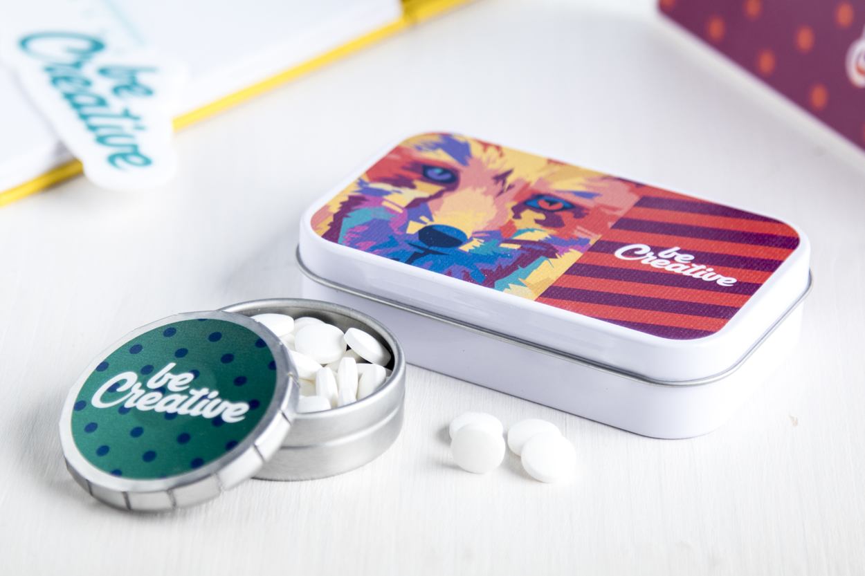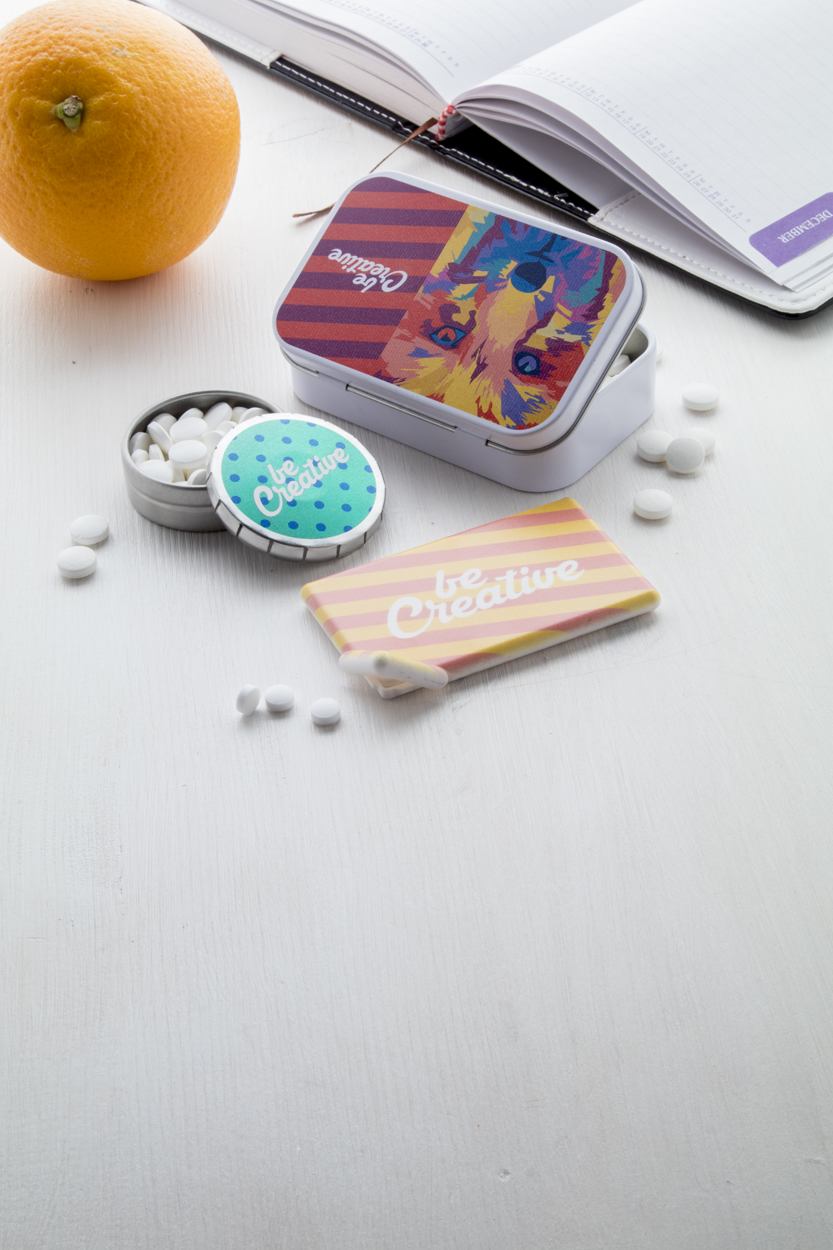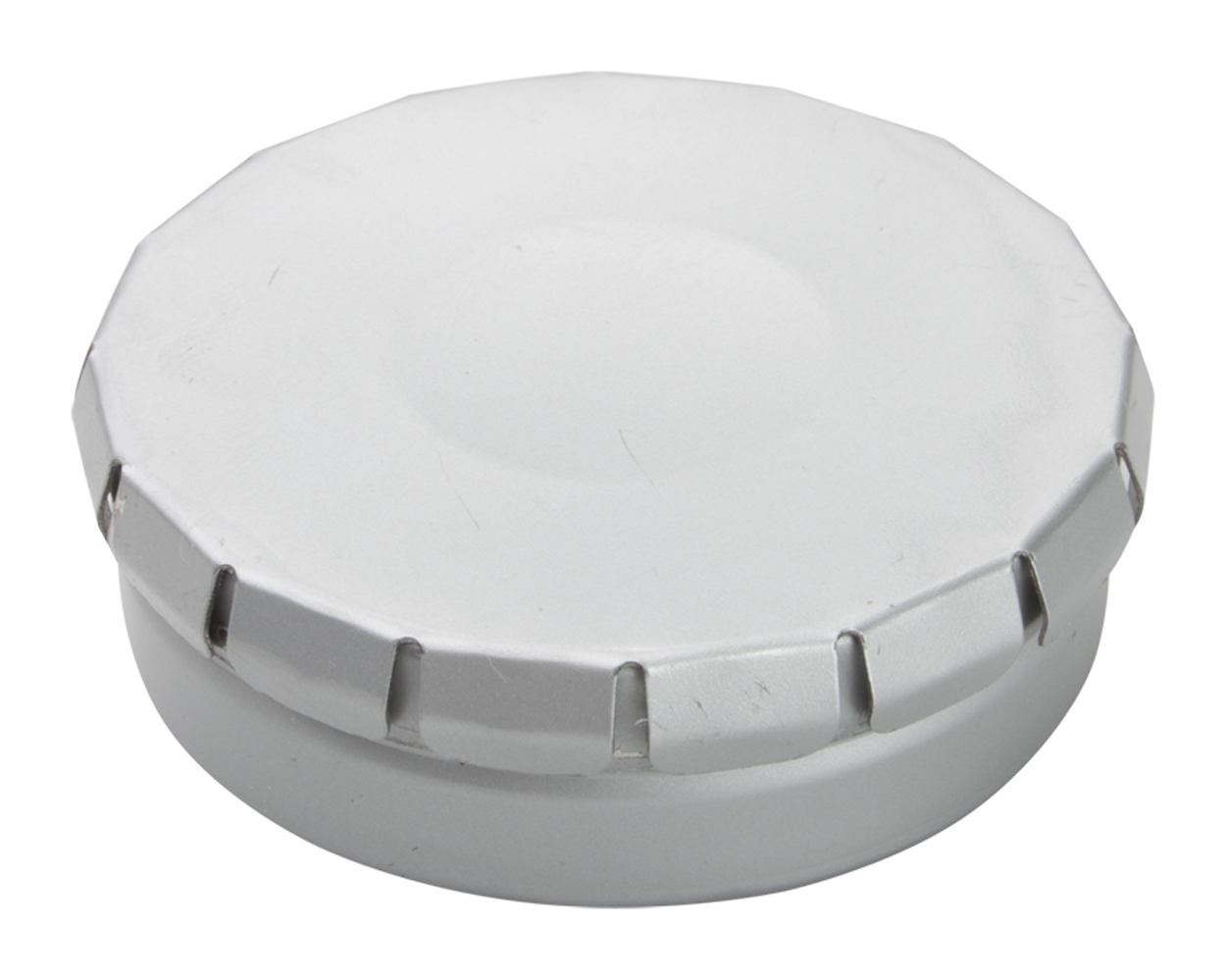 Runde Minzdose aus Metall mit ca. 12 g Minzbonbons. Kann durch Drücken des Deckels geöffnet werden.