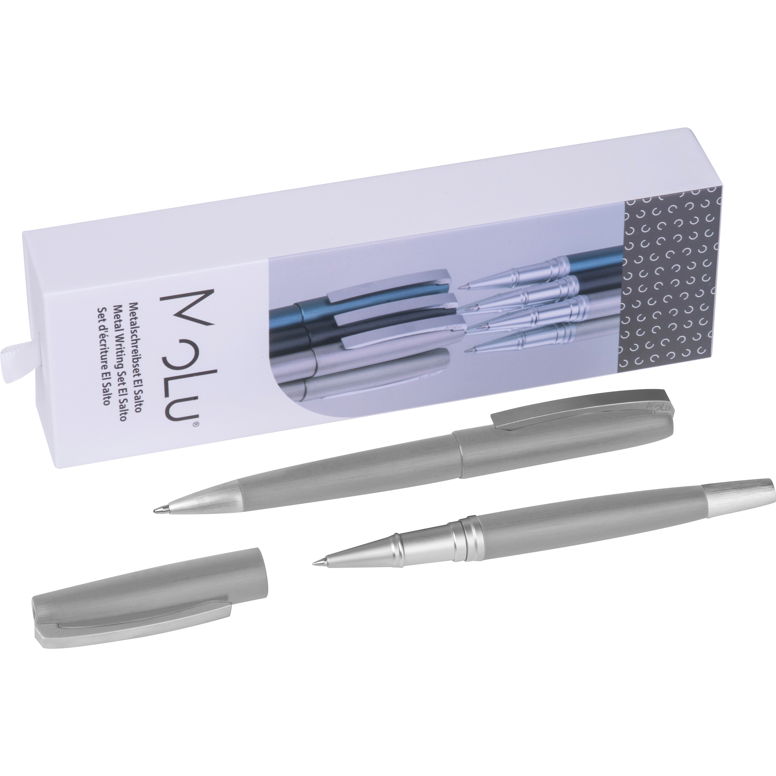 MoLu Metal Writing Set – Schlicht. Stark. Stilvoll. Enthält zwei edle Metallschreiber mit breitem Clip – Kugelschreiber & Rollerball. Ausgestattet mit Parker-System-Minen, blauschreibend und austauschbar. Verpackt in einer hochwertigen, ausziehbaren Geschenkbox. Ihr Logo wird auf den Clips veredelt.