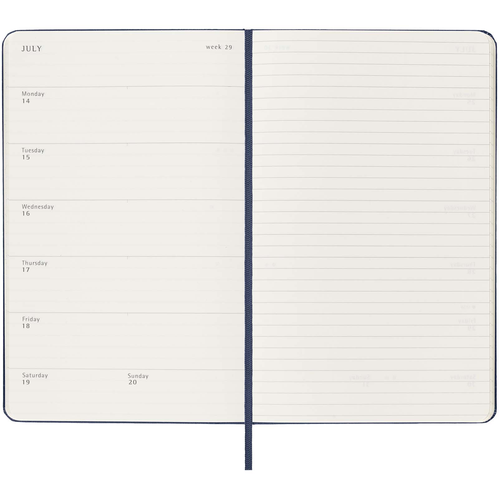 Der von Januar bis Dezember 2026 datierte Moleskine Hardcover Wochenplaner für 12 Monate zeigt die ganze Woche auf einen Blick, bietet aber auch Jahres- und Monatsübersichtsseiten für einen breiteren Jahresüberblick, gefolgt von Seiten für Reiseplanung, Ideen und Ziele. Auf der einen Seite sind die Wochentage dargestellt, gegenüber befindet sich eine linierte Seite, auf der Aufgaben und Notizen eingetragen werden können. Er enthält elfenbeinfarbenes, säurefreies Papier, einen schwarzen, elastischen Verschluss, ein Seitenband, eine farblich abgestimmte, erweiterbare Innentasche und Aufkleber zur persönlichen Gestaltung sowie Jahresaufkleber für den Buchrücken.