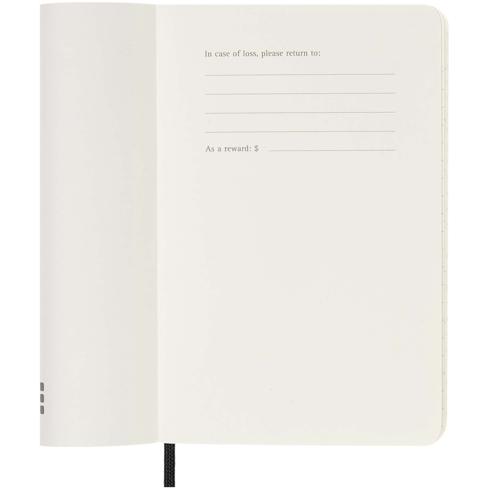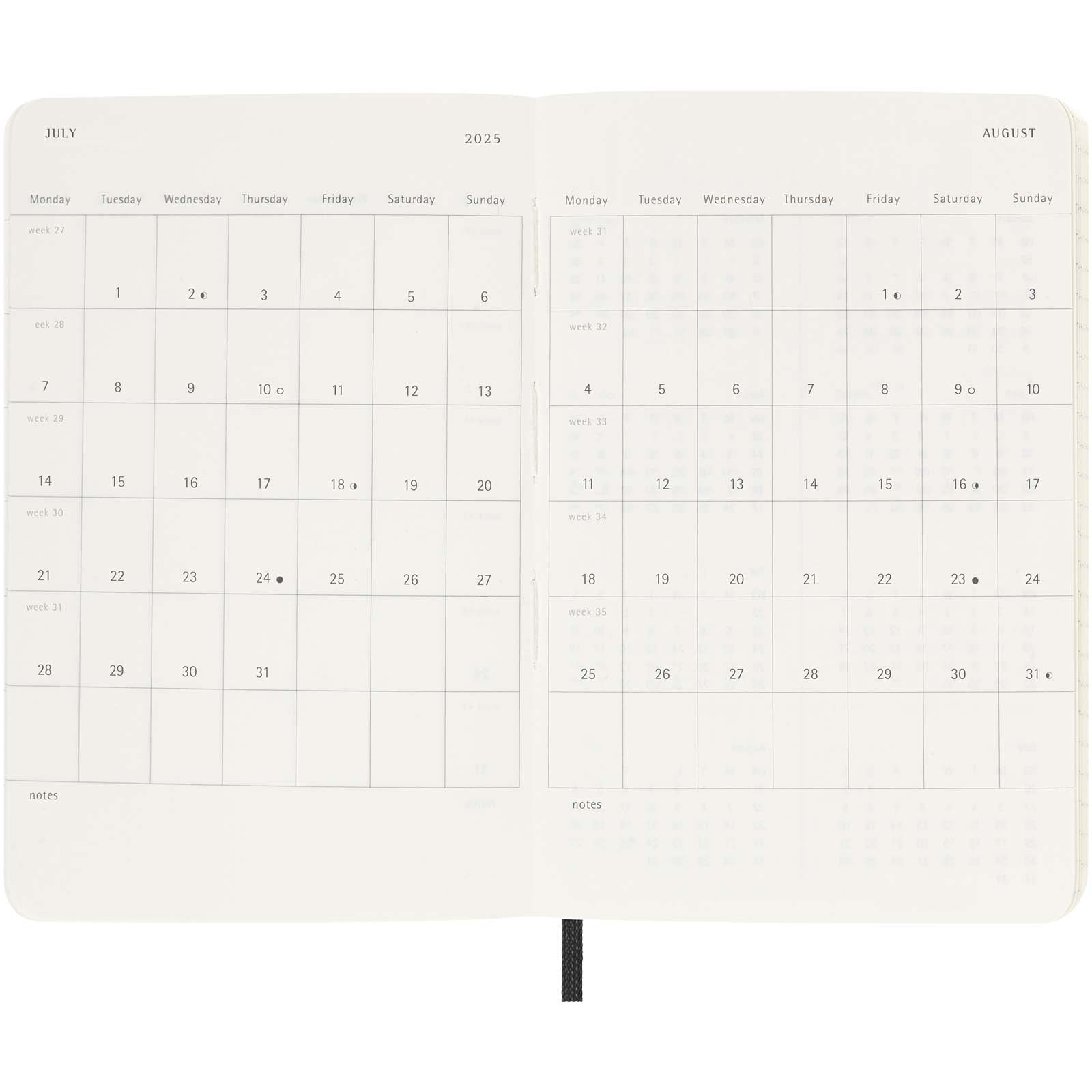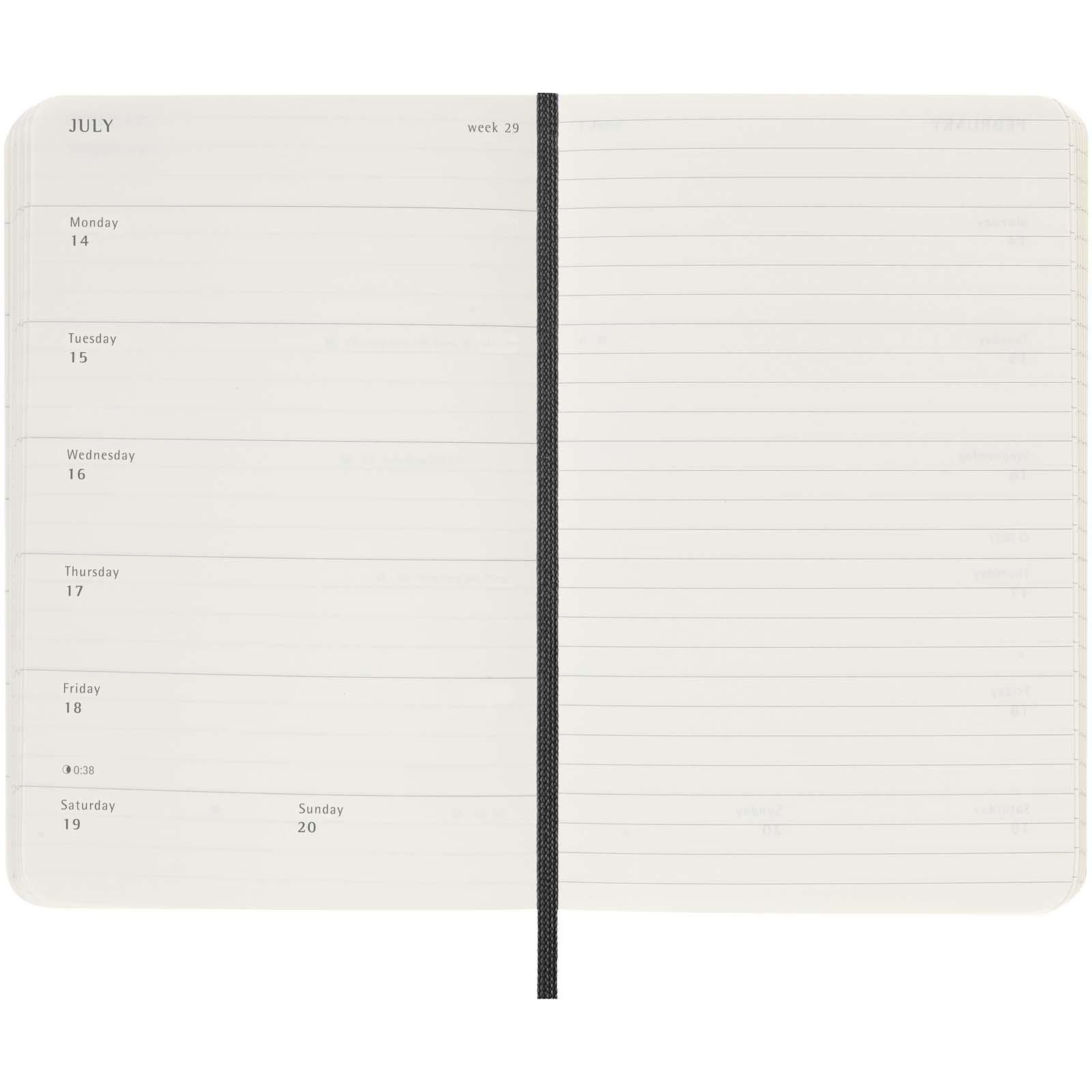 Der von Januar bis Dezember 2026 datierte Moleskine Softcover Wochenplaner im Taschenformat für 12 Monate zeigt die ganze Woche auf einen Blick, bietet aber auch Jahres- und Monatsübersichtsseiten für einen breiteren Überblick über das Jahr, gefolgt von Seiten für Reiseplanung, Ideen und Ziele. Auf der einen Seite sind die Wochentage dargestellt, gegenüber befindet sich eine linierte Seite, auf der Aufgaben und Notizen eingetragen werden können. Er enthält elfenbeinfarbenes, säurefreies Papier, einen schwarzen, elastischen Verschluss, ein Seitenband, eine farblich abgestimmte, erweiterbare Innentasche und Aufkleber zur persönlichen Gestaltung sowie Jahresaufkleber für den Buchrücken.