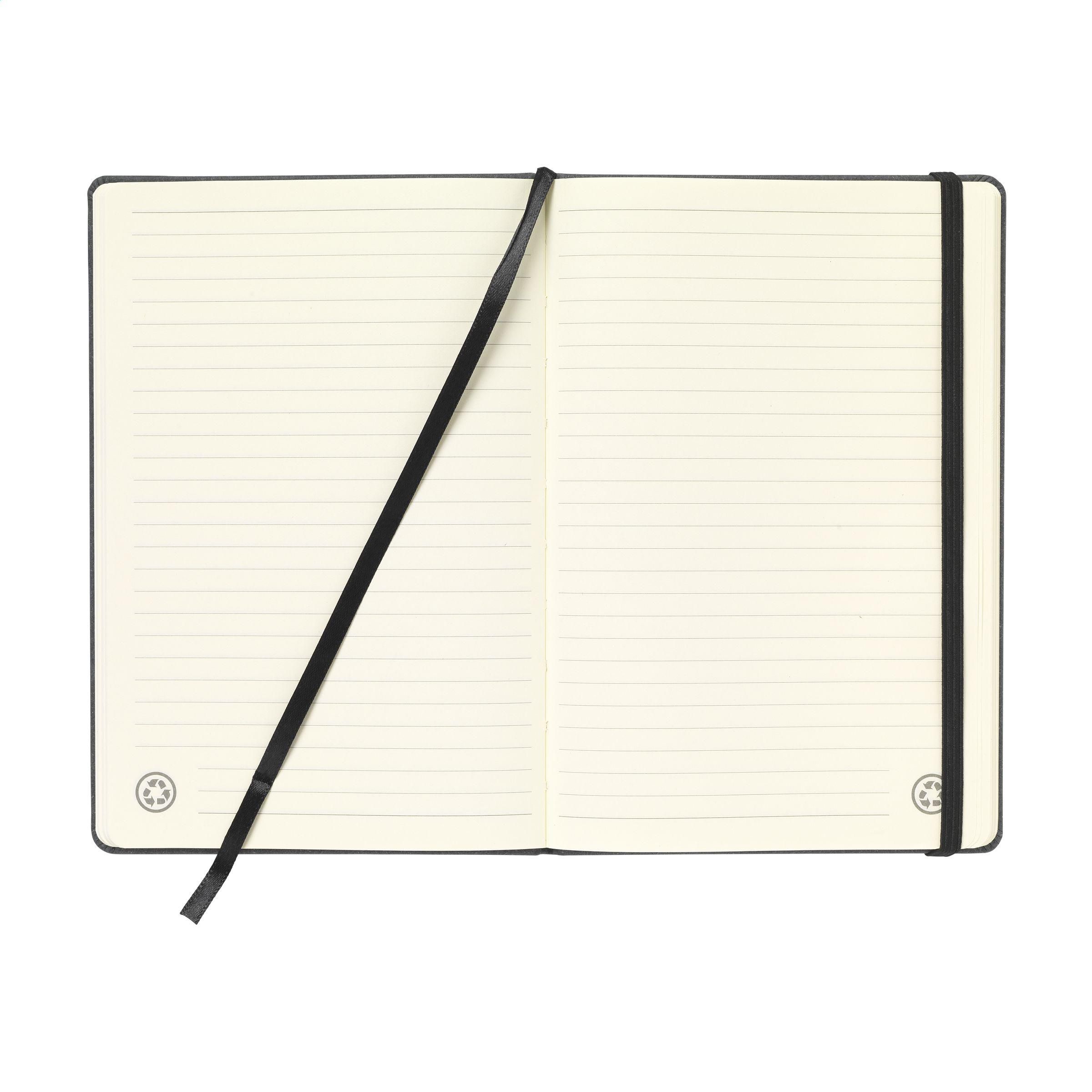 A5-Notizbuch mit einem Hardcover aus recycelten Lederabfällen. Das Notizbuch umfasst ca. 96 Blatt/192 Seiten cremefarbenes, liniertes, FSC Mix zertifiziertes Papier (80 g/m²). Mit gebundenem Buchrücken, praktischem Verschlussgummi und seidener Leselitze.