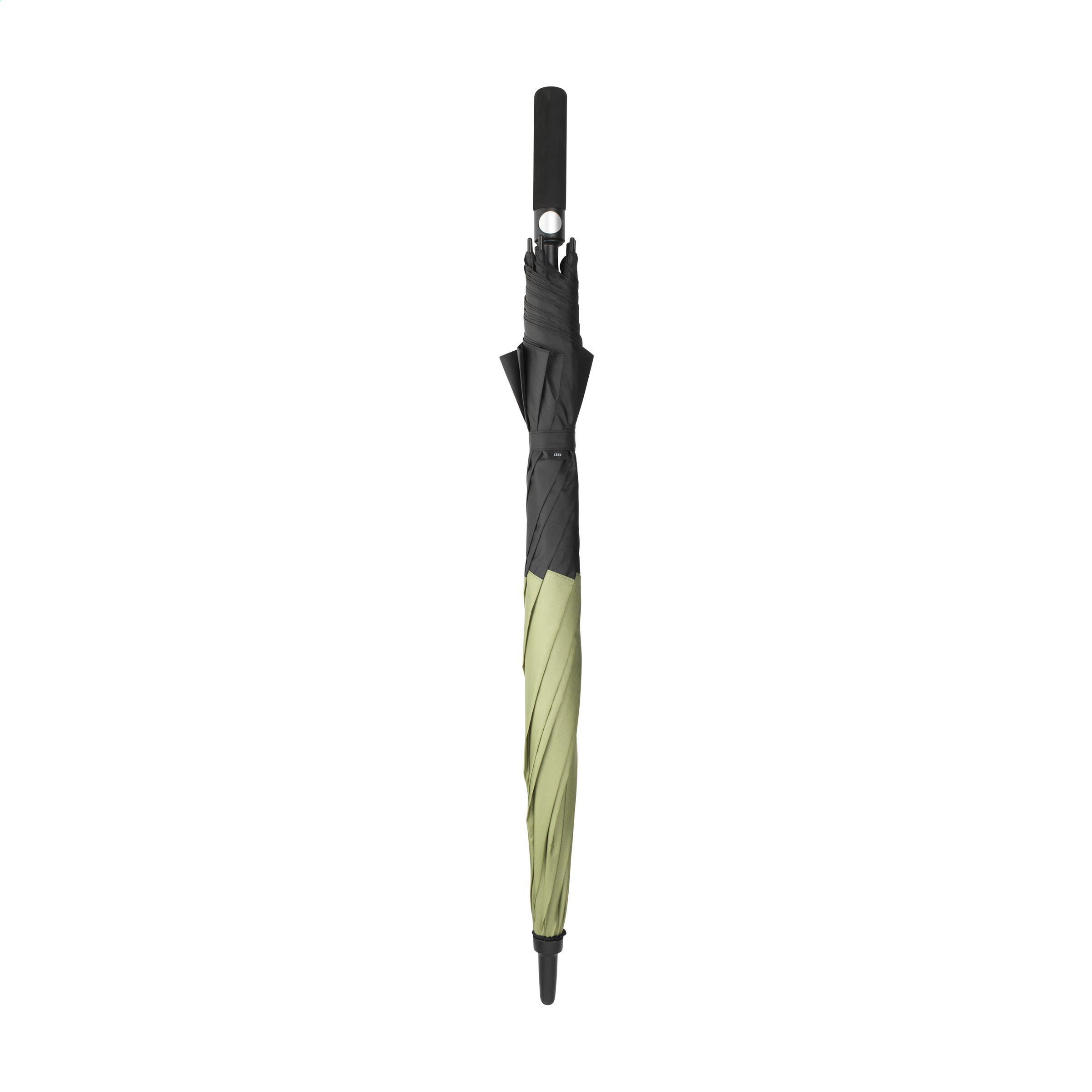 Regenschirm mit einer 2-farbigen Bespannung aus 190T RPET-Polyester. Dieser auffällige Regenschirm hat einen extragroßen Schirmdurchmesser von 120 cm. Mit automatischer Teleskopöffnung, Fiberglasrahmen und -schaft, Griff aus EVA-Weichschaum und Klettverschluss. Dieser Regenschirm wird teilweise aus recycelten PET-Flaschen hergestellt.