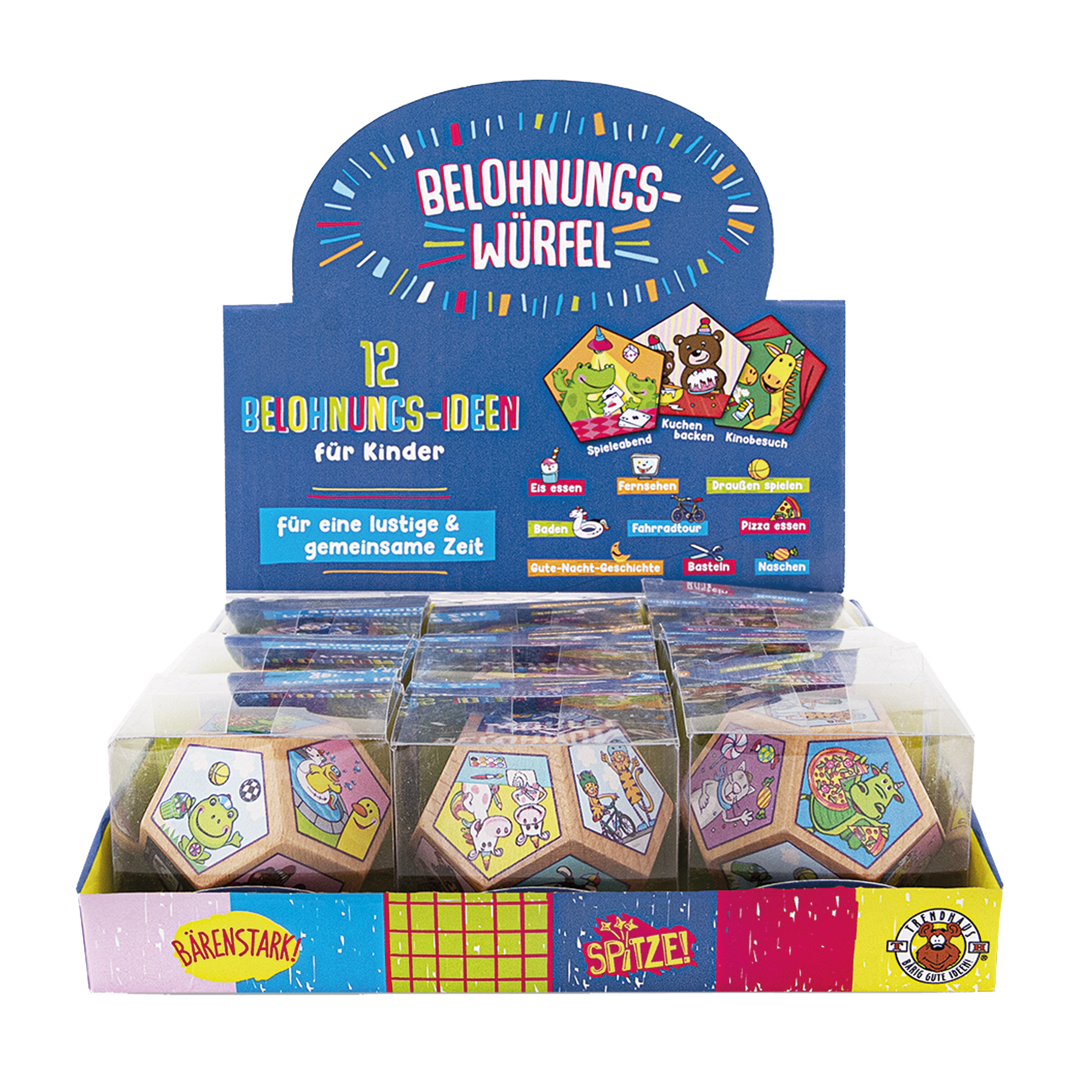 Dieser schöne Holz-Belohnungswürfel wird Kinder begeistern und ihren Ehrgeiz wecken und eignet sich ideal, um Kinder für besondere Leistungen mit gemeinsamer Zeit und Aktivitäten zu belohnen. Auf dem bunten Würfel befinden sich insgesamt 12 liebevolle illustrierte Belohnungsmotive, wie z. B. Spieleabend, Basteln, Vorlesen usw., für eine schöne, gemeinsame Zeit.