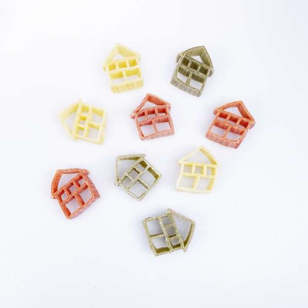 Leckere Motivpasta in Haus-Form aus Manufaktur-Produktion. Nudelfarben gemischt: natur-gelb, orange-rot, grün. Sortenreine Nudelfarbe oder Sonderfarbe auf Anfrage möglich. Kochzeit: ca. 10 Minuten. Verpackt in transparenter Tüte mit Clip verschlossen. Tütengrößen: 125 g, 250 g oder 500 g. Nudeln ohne Geschmacksverstärker, ohne Konservierungsstoffe, ohne künstliche Farbstoffe und ohne chemische Zusätze. Mindesthaltbarkeit: 36 Monate bei trockener Lagerung.