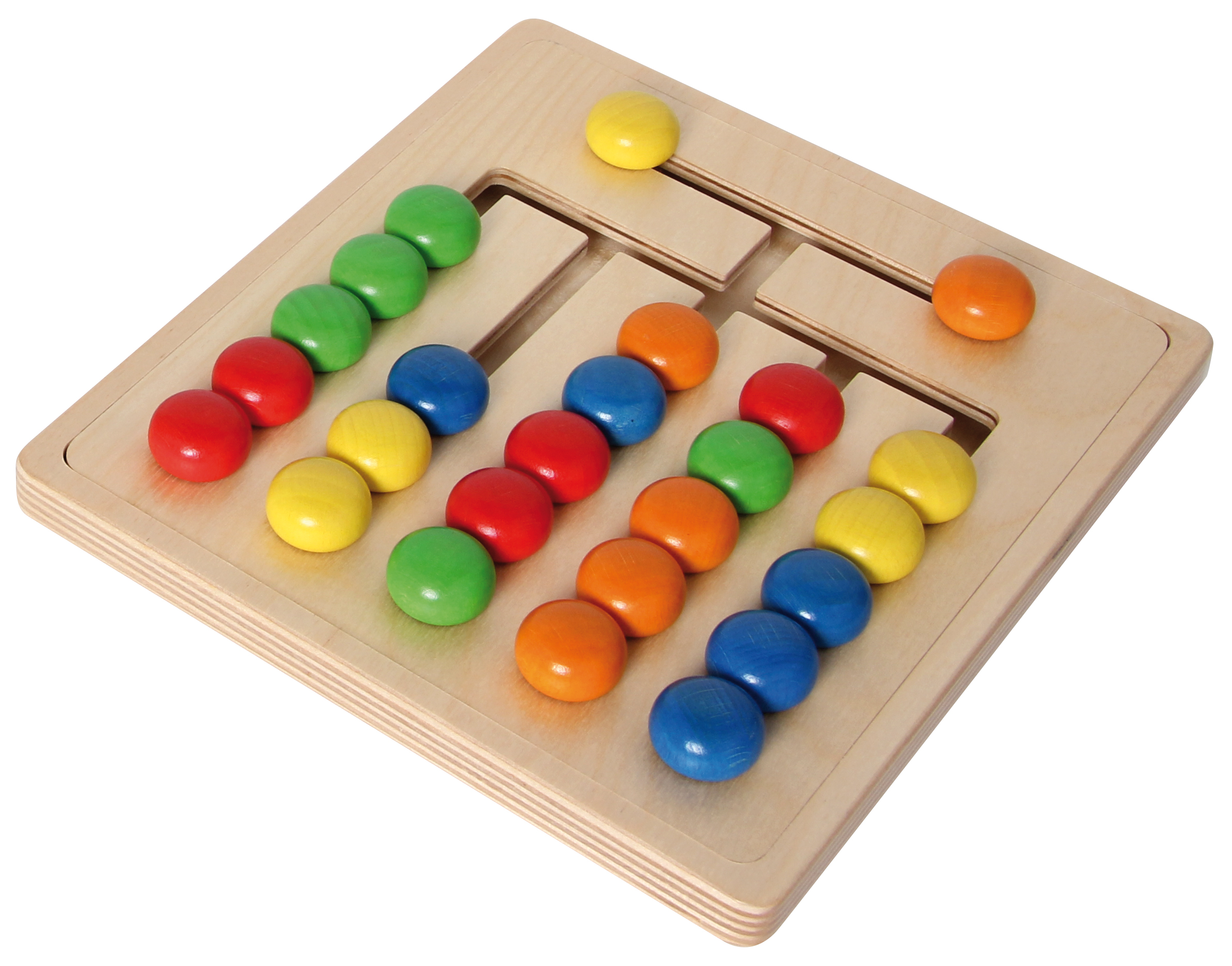 Die auf den Vorlagenkarten abgebildeten Anordnungen sollen durch überlegtes Verschieben der farbigen Scheiben in den Bahnen nachgebildet werden. Geeignet für Kinder ab 24 Monaten.