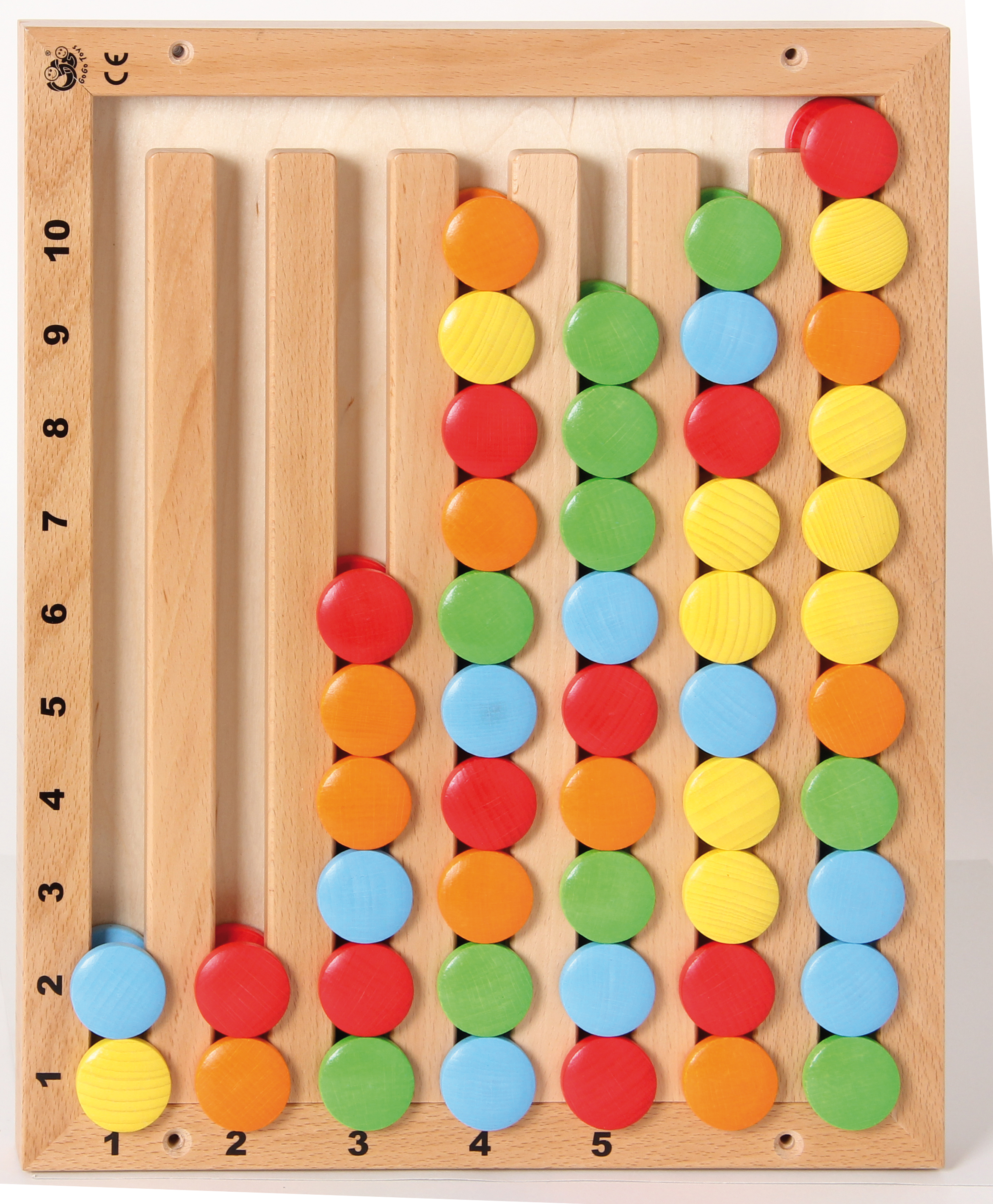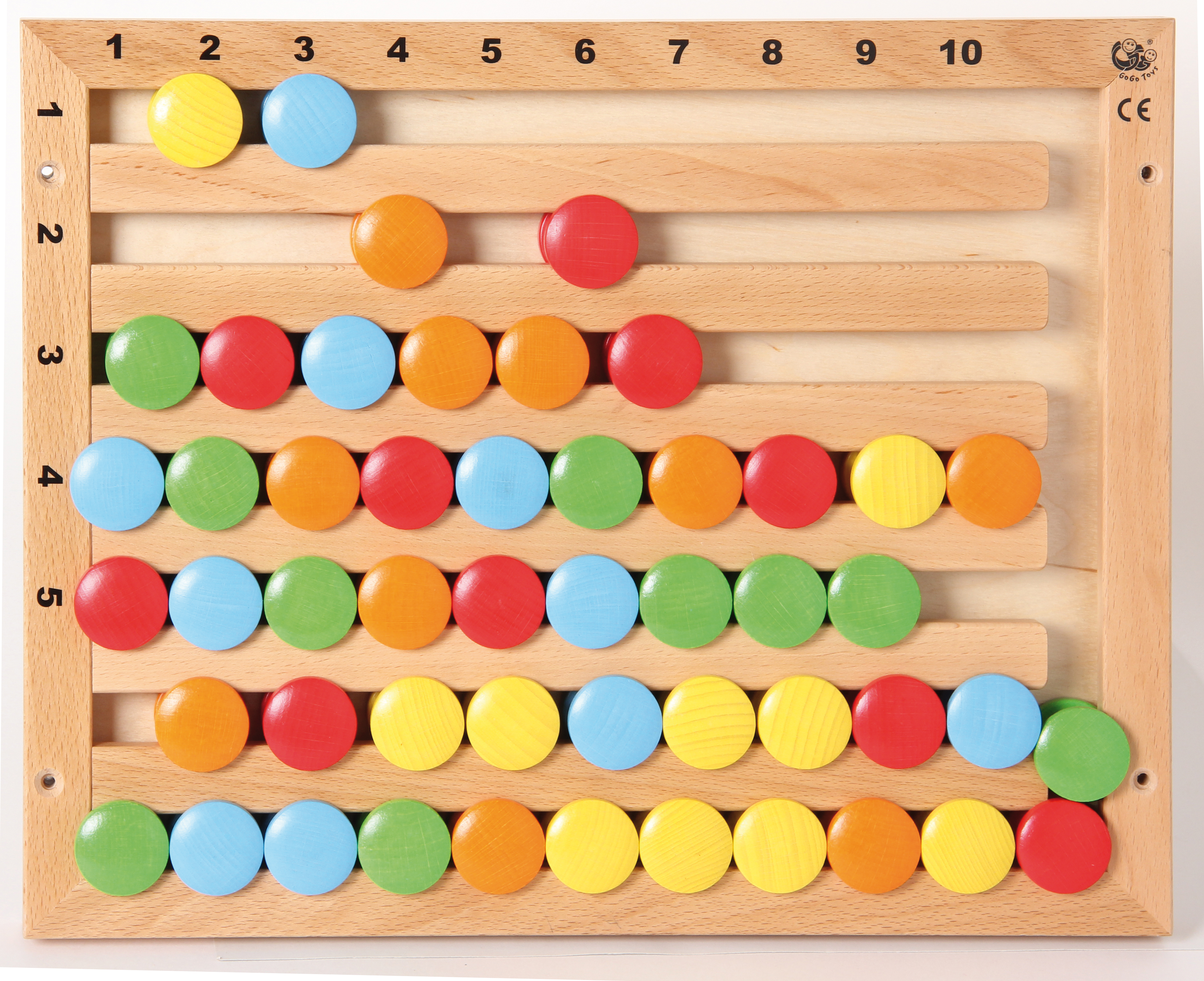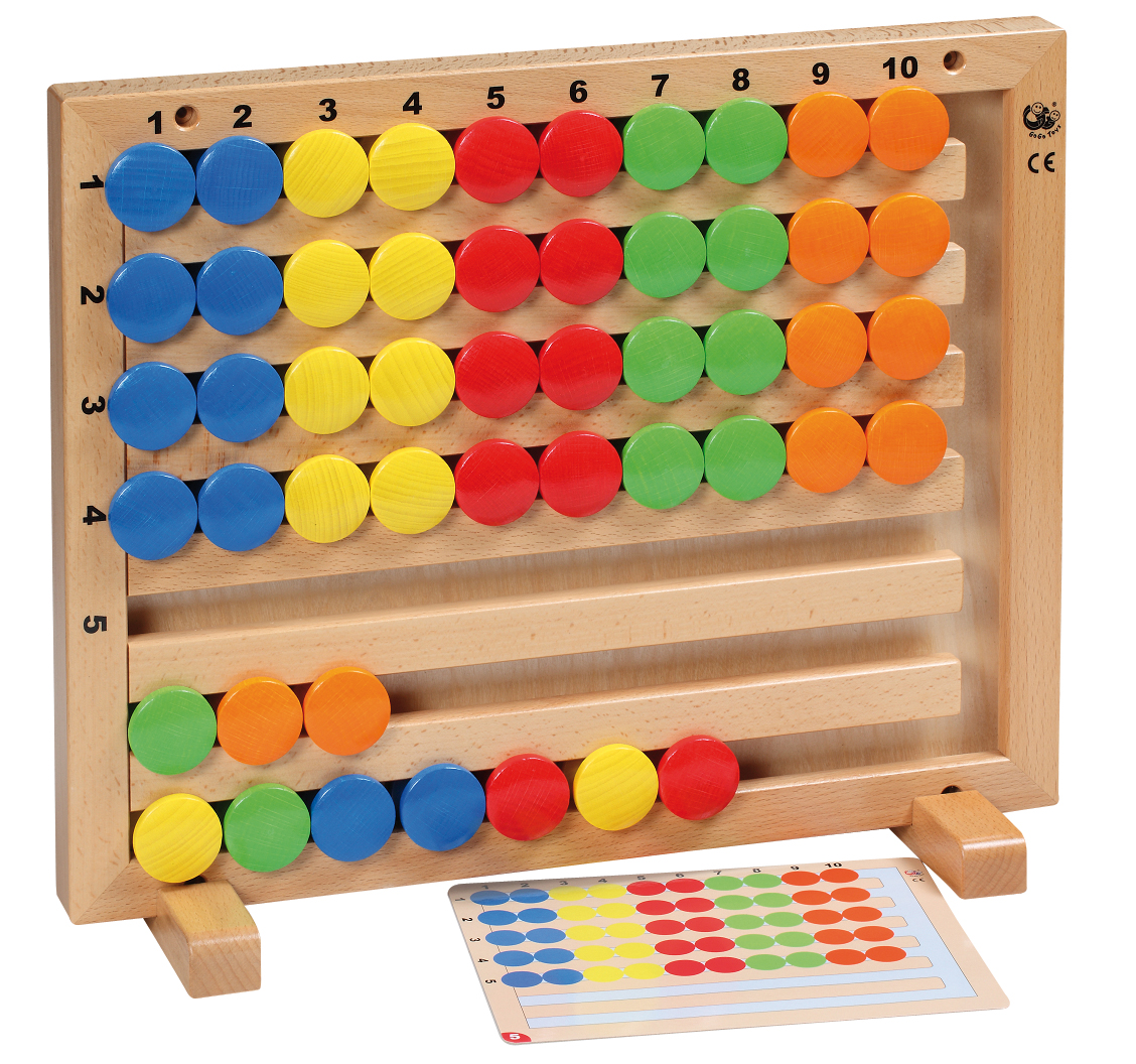 Als Wandspiel oder frei auf dem Tisch, kann das hochwertige Motorikspiel vertikal oder horizontal bespielt werden. Beim Zählen und Sortieren sind die Kleinen lange beschäftigt. Um die auf den Vorlagenkarten abgebildeten Farben und Reihenfolgen nachzubilden, müssen die farbigen Scheiben in den Bahnen überlegt sortiert und verschoben werden. Das Spiel fördert die Feinmotorik, die Farberkennung, das logische Denken und die Ablaufplanung.