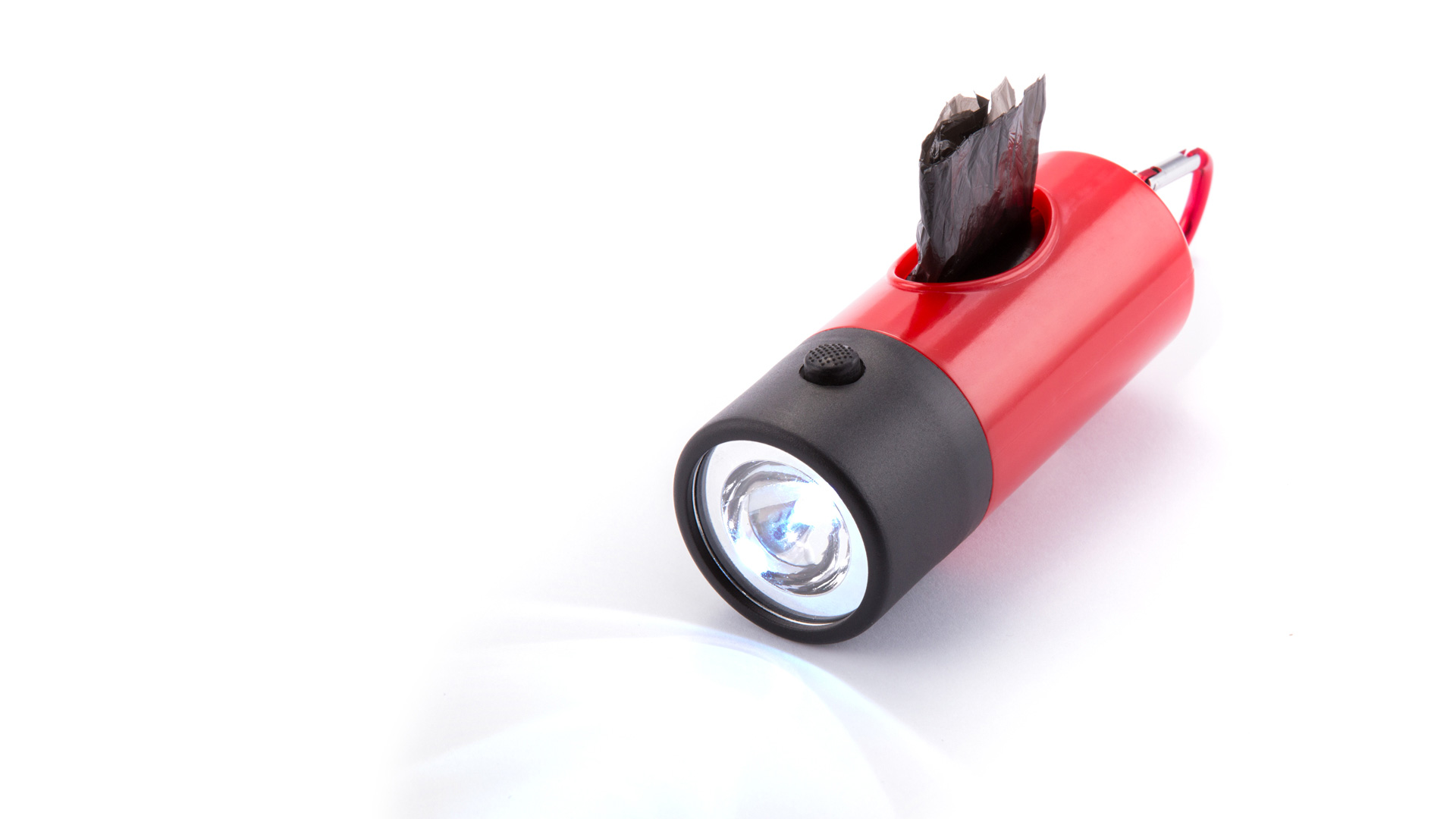 Beutelspender für Haustiere mit widerstandsfähigem Gehäuse in leuchtenden Farben. Mit integrierter LED-Taschenlampe. Inklusive 15 Beutel.