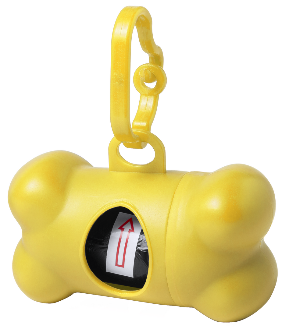 Beutelspender für Hundekot mit robustem Gehäuse in Knochenform und kräftigen Farben. Mit Befestigungskarabiner und 15 Beuteln.