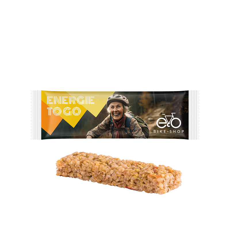 Müsliriegel Multikorn Apfel in weißer Folie, individuell bedruckt. Inhalt: 1 Müsliriegel mit hochwertigen Getreidearten, Apfelstückchen und Rosinen