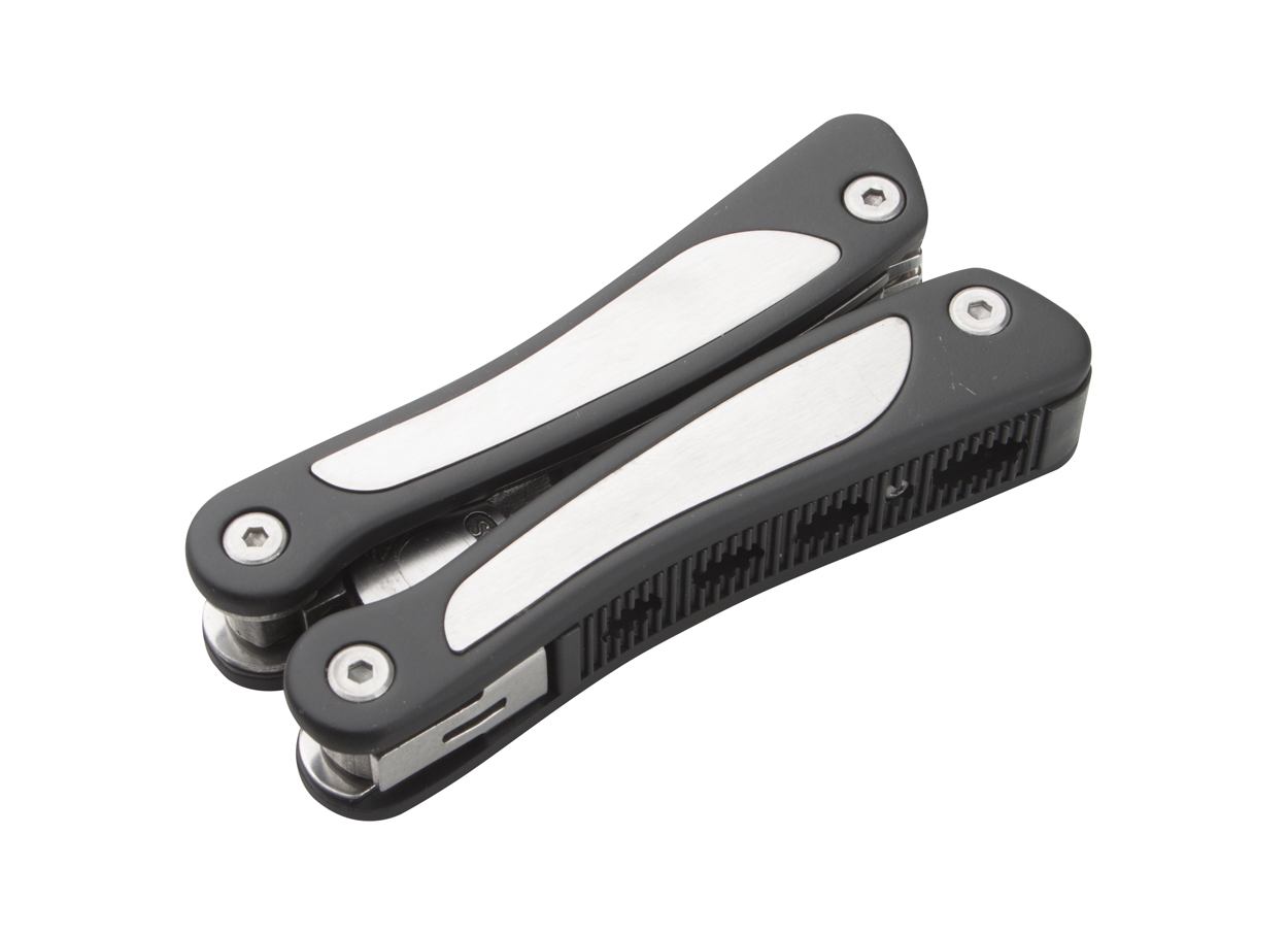 Multi-Tool aus Edelstahl mit neun Funktionen: Zange, Nagelfeile, drei Schraubendreher, Messer in zwei Größen, Dosenöffner und Säge. Einzeln in schwarzem Polyester-Etui.