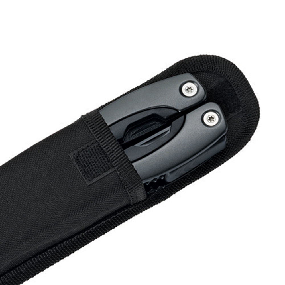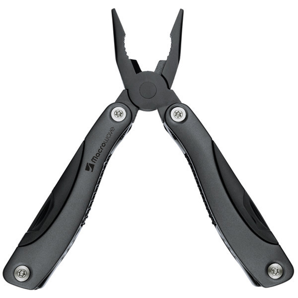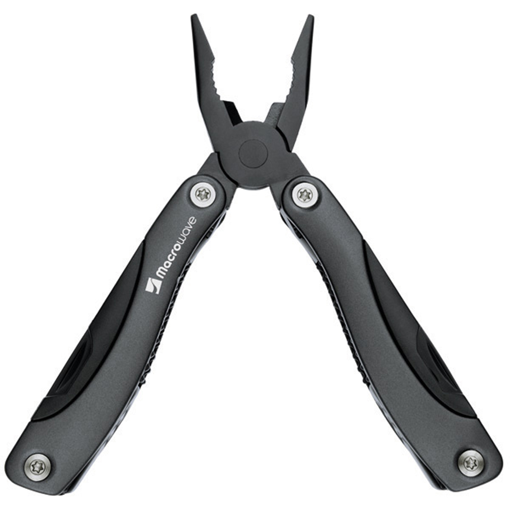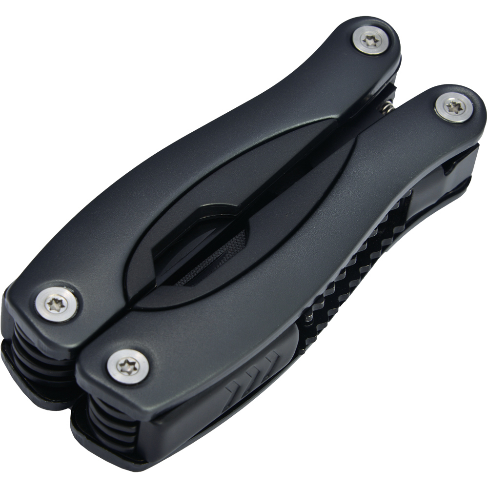 Multi-Werkzeug mit 12 Funktionen. Material: Multi-Tool und Zangenkopf sowie Werkzeuge aus 2Cr13 Stahl, schwarz beschichtet, Griffschalen aus titanfarben eloxiertem Aluminium und ABS, 600D Nylon-Gürteltasche. Werkzeuge: Zange mit Seitenschneider, Messer (Klingenlänge 60 mm), Säge, Phillips-Schraubendreher, 3 x Schlitz-Schraubendreher (3/ 4/ 6 mm), Dosenöffner, Kronkorken-Heber, Metallfeile und Ahle. Funktionen: Verriegelungsschutz der Werkzeuge, innenliegende Feder. Zubehör: Nylon-Gürteltasche. Verpackung: schwarze Geschenkverpackung.