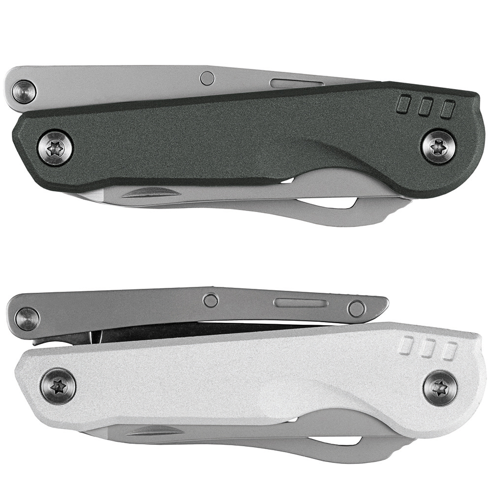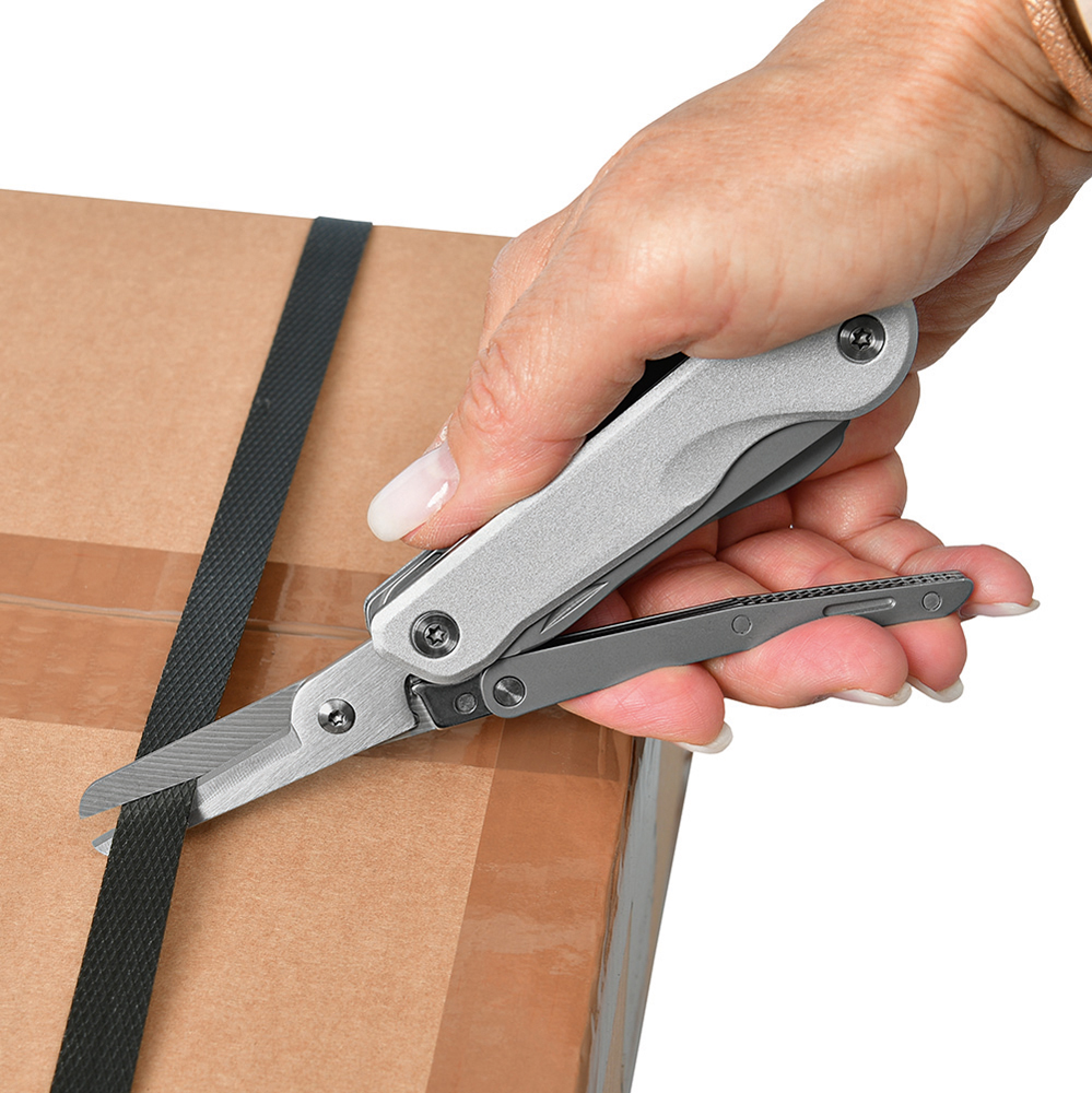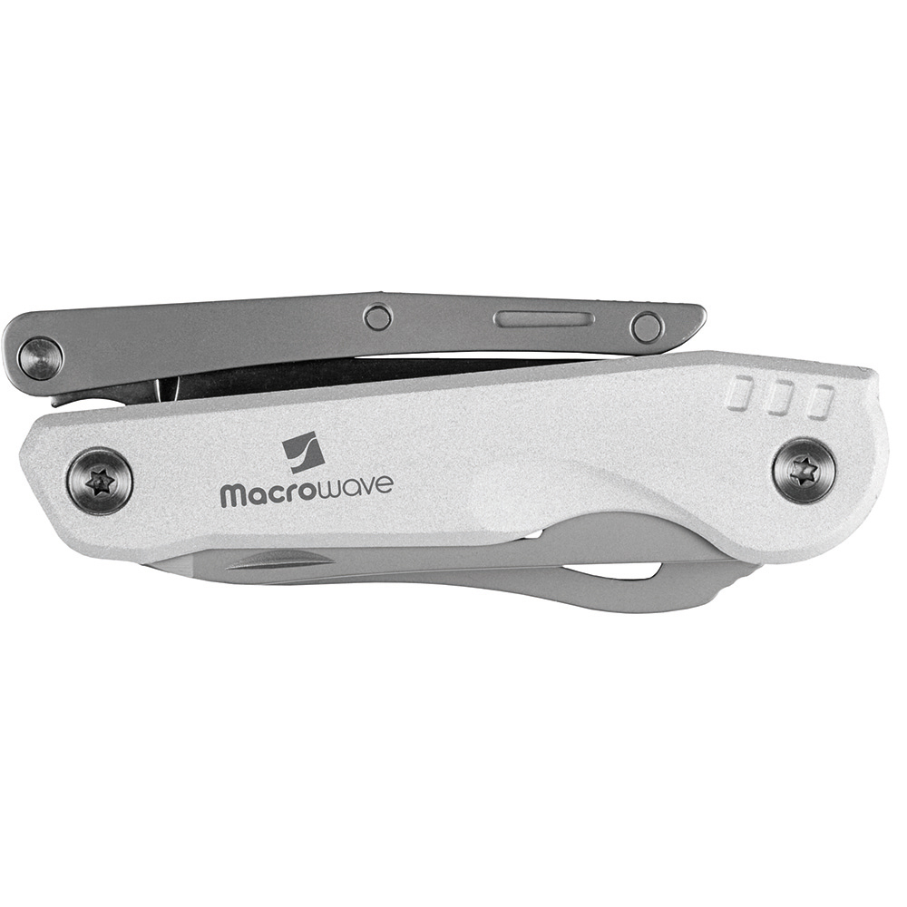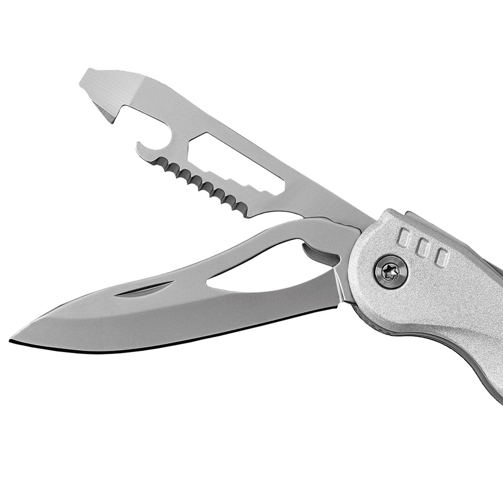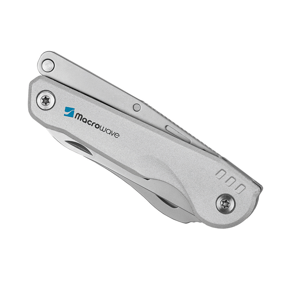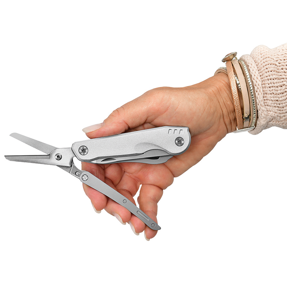 Multi-Werkzeug mit 7 Funktionen. Material: Werkzeuge aus 3Cr13 Edelstahl, Griff Schere aus 2Cr13 Edelstahl, Griffschalen Multitool aus eloxiertem Aluminium. Werkzeuge: Schere, Messer (Klingenlänge 60 mm), Schraubenschlüssel (5/ 6/ 7/ 8/ 9 mm), Schlitzschraubendreher (4 mm), Kronkorken-Heber, Säge, Dosenöffner. Verpackung: schwarze Geschenkverpackung.