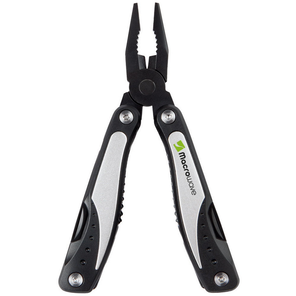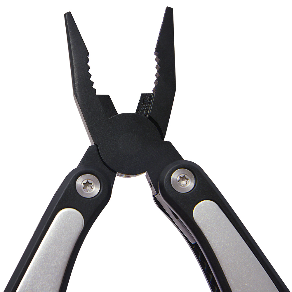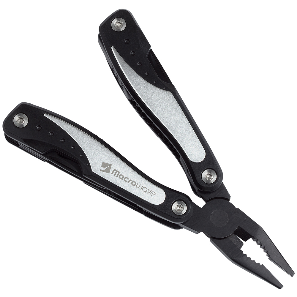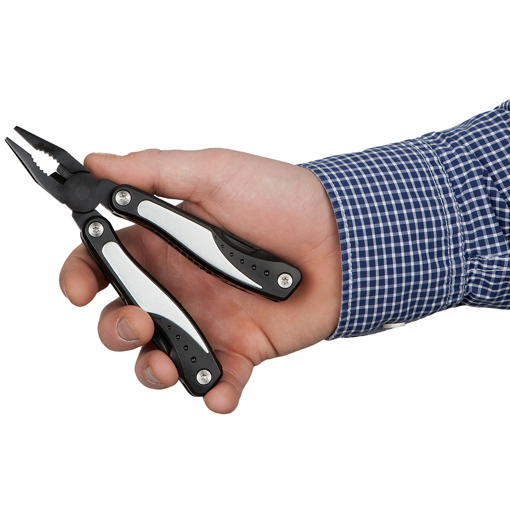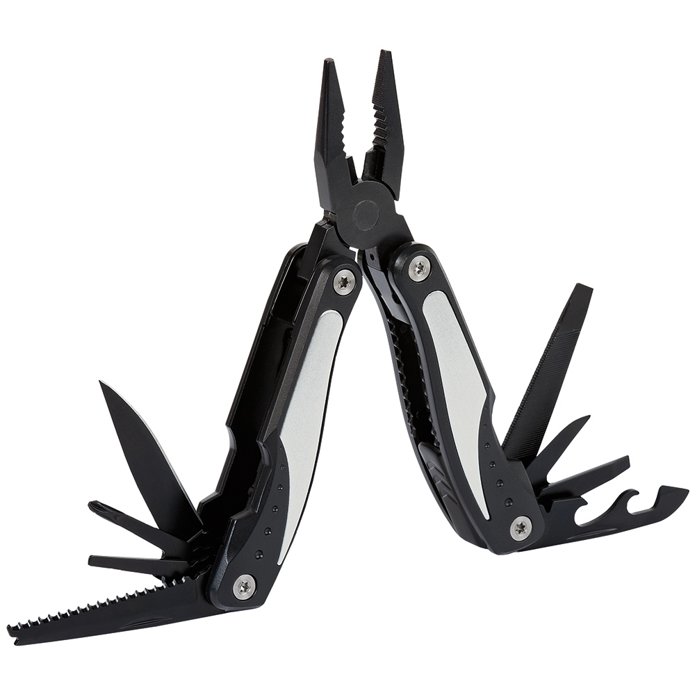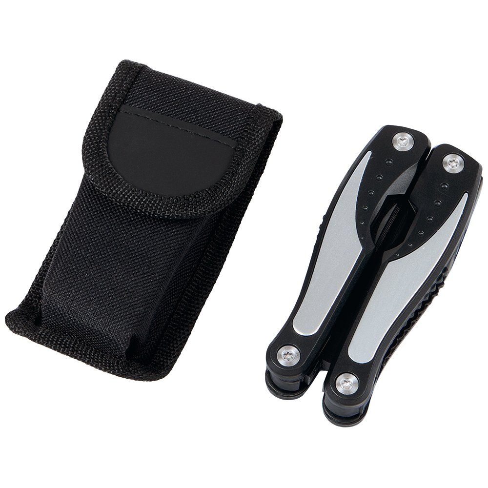 Multi-Werkzeug mit 12 Funktionen. Material: Multi-Tool und Zangenkopf sowie Werkzeuge aus 2Cr13 Stahl schwarz beschichtet, Griffschalen aus ABS mit schwarz eloxierten Aluminiumdekoreinlagen, 600D Nylon-Gürteltasche. Werkzeuge: Säge, 3 x Schlitz-Schraubendreher (3/4/6 mm), Phillips-Schraubendreher, Messer (Klingenlänge 60 mm), Dosenöffner, Kronkorken-Heber, Ahle, Metallfeile, Zange mit Seitenschneider. Funktionen: Verriegelungsschutz der Werkzeuge, innenliegende Feder. Zubehör: Nylon-Gürteltasche. Verpackung: schwarze Geschenkverpackung.