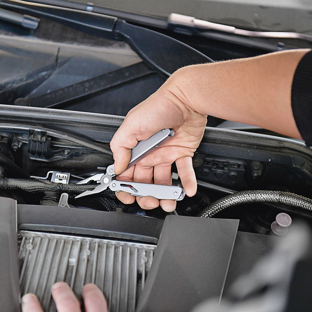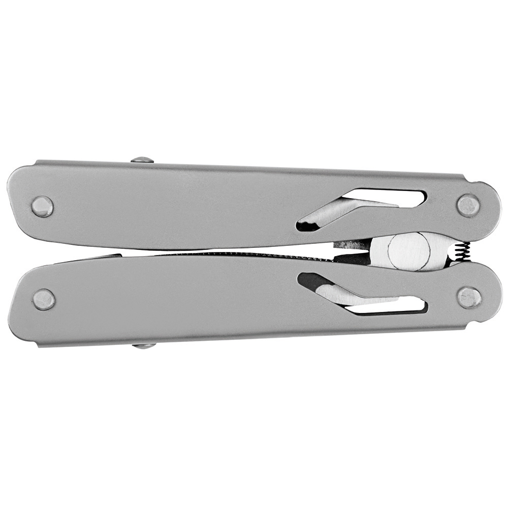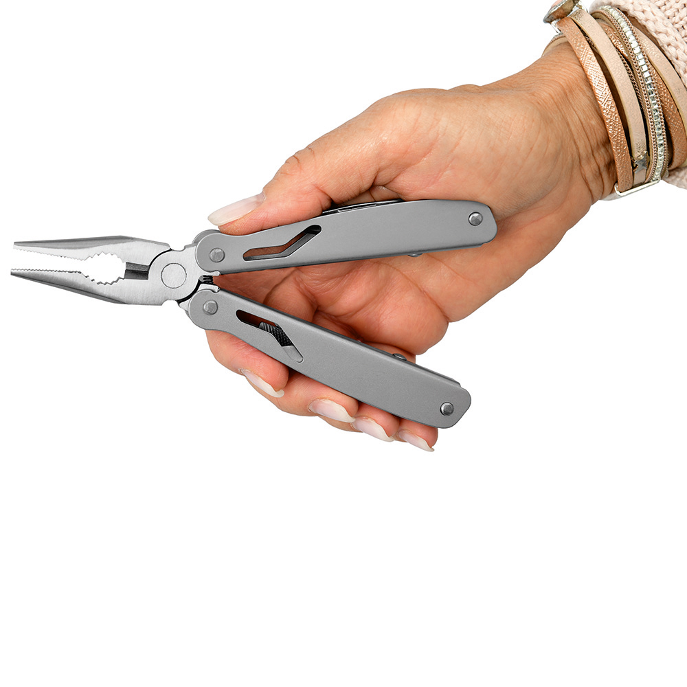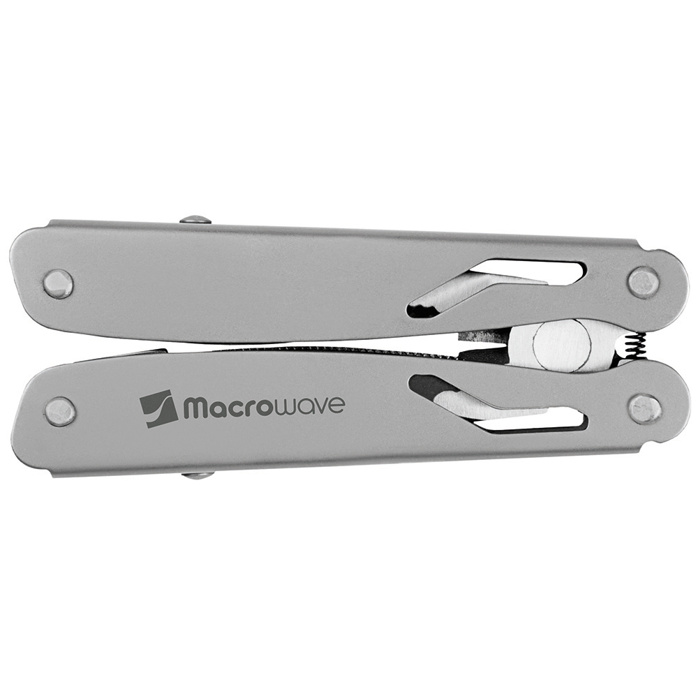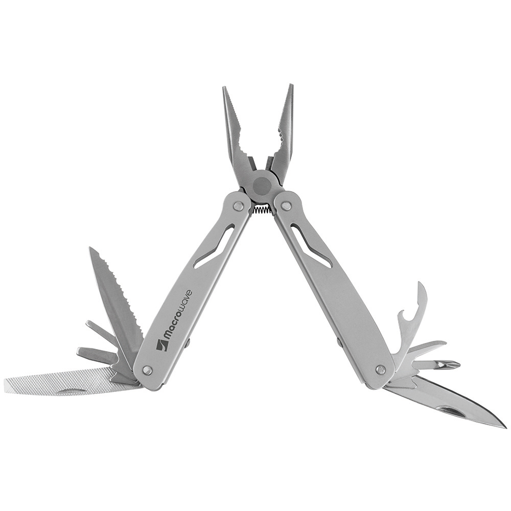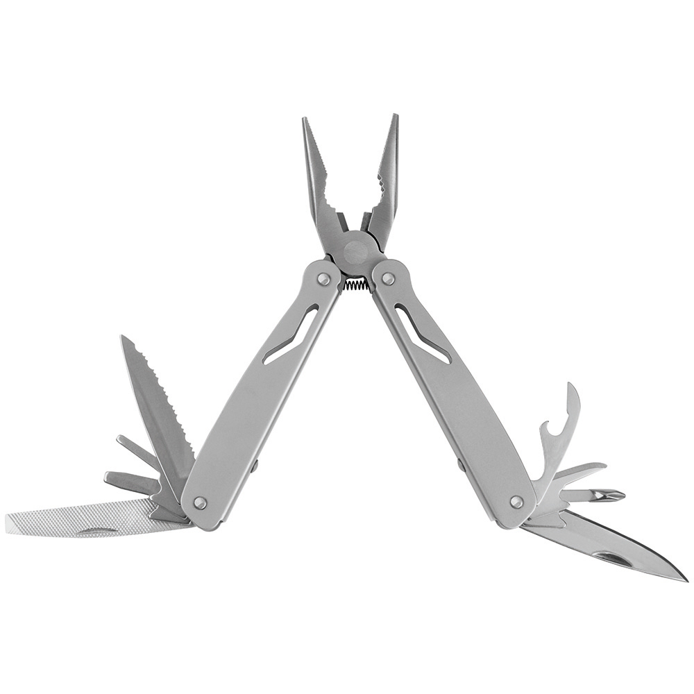 Multi-Werkzeug mit 12 Funktionen. Material: 2Cr13 Edelstahl sandgestrahlt, Werkzeuge poliert. Werkzeuge: Spitzzange, normale Zange, Drahtschneider, Messer (Klingenlänge: 53 mm), Phillips-Schraubendreher (PH1), Stech-Bohr-Ahle, Kronkorken-Heber, Dosenöffner, Säge, 2 x Schlitzschraubendreher (3/ 5), Messer mit gewellter Klinge (Klingenlänge: 53 mm). Verpackung: schwarze Geschenkverpackung.