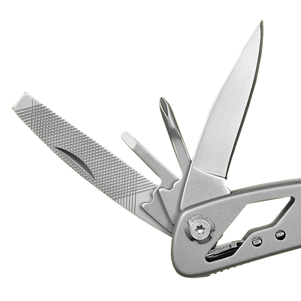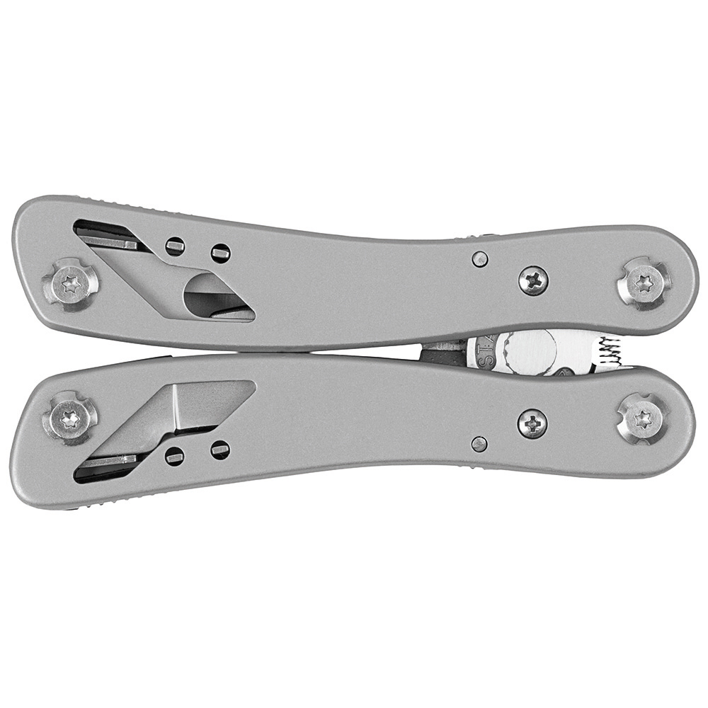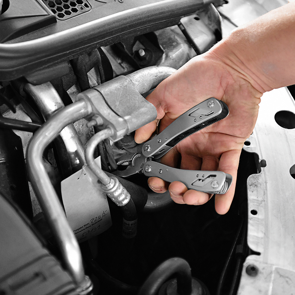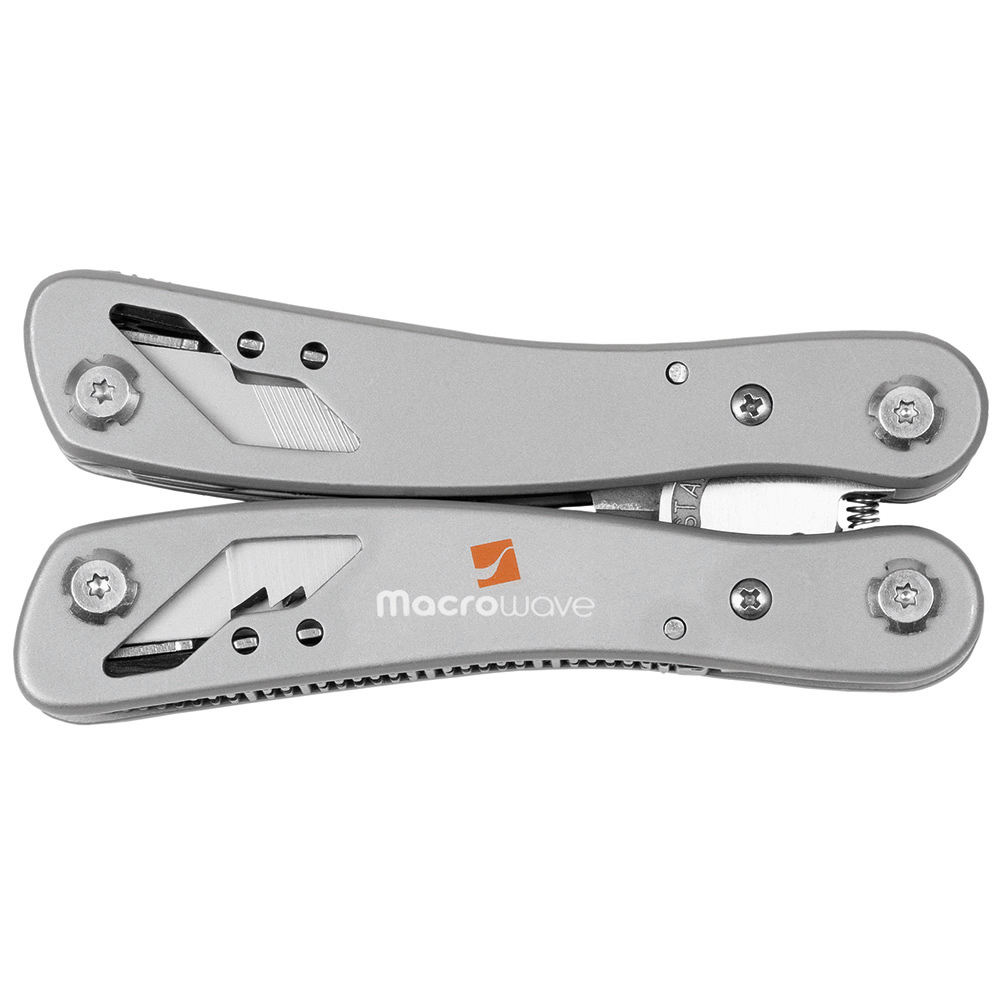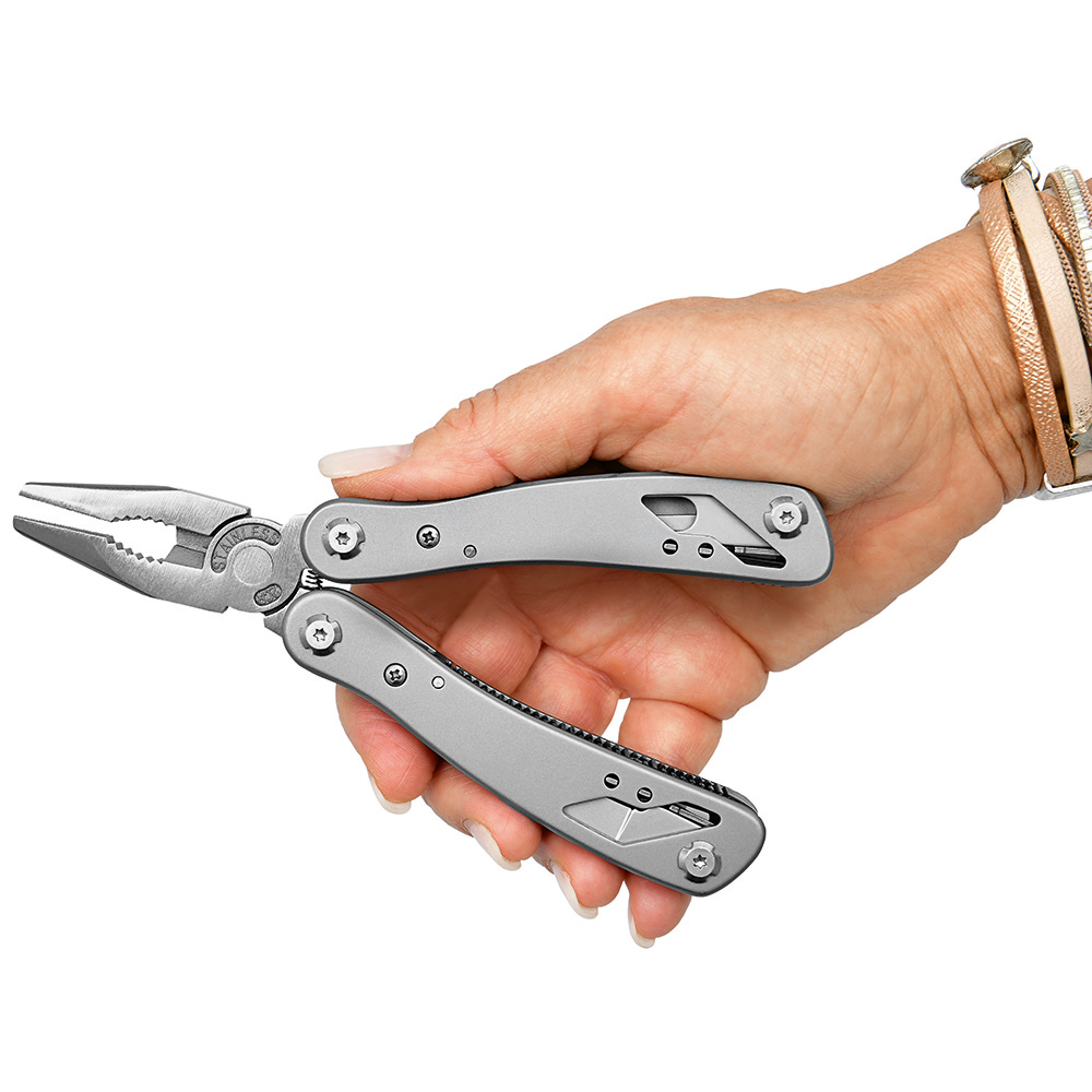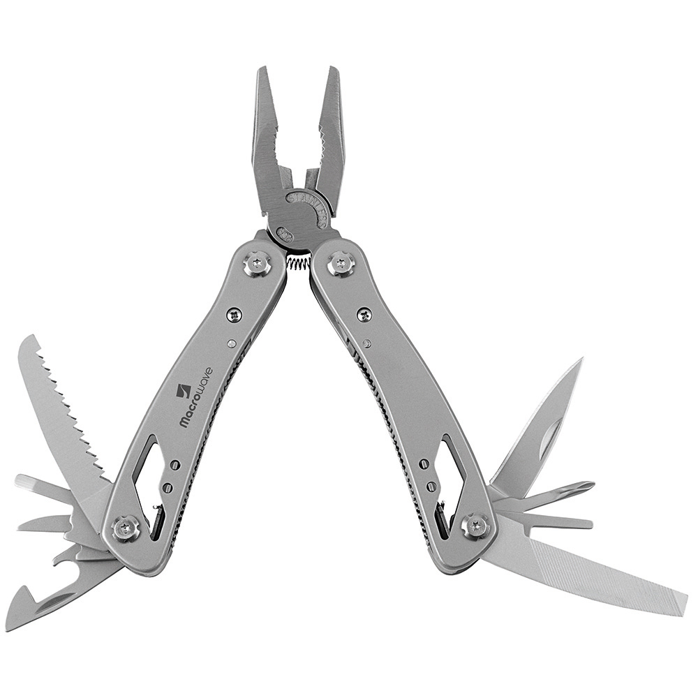 Multi-Werkzeug mit 11 Funktionen. Material: 2Cr13 Edelstahl sandgestrahlt, Griffeinlage aus ABS. Werkzeuge: Spitzzange, normale Zange, Drahtschneider, Holzsäge, 2 x Schlitzschraubendreher (3/ 5), Stech-Bohr-Ahle, Dosenöffner, Feile, Phillips-Schraubendreher (PH1), Messer (Klingenlänge: 48 mm). Verpackung: schwarze Geschenkverpackung.