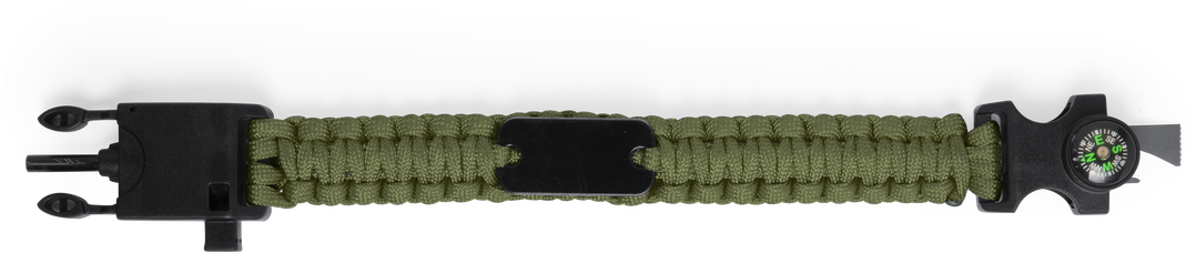 Multifunktionsarmband für Abenteuerlustige. Aus widerstandsfähigem Nylonmaterial, mit 5 Funktionen: Armband, Kompass, Pfeife, Feuersteinschaber und Öffner. Erhältlich in einer breiten Palette von Farben, mit Sicherheitsschnalle.
