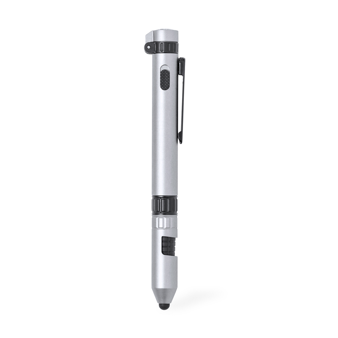 Handlicher Multifunktionsstift mit 7 Verwendungsmöglichkeiten. Lieferumfang: Handyhalter, Stylus, blauer Tintenstift, Taschenlampe mit Knopfzellenbatterie (im Lieferumfang enthalten), Kompass, Flach- und Kreuzschlitzschraubendreher. Einzeln präsentiert in einer Kraft-Design-Box.