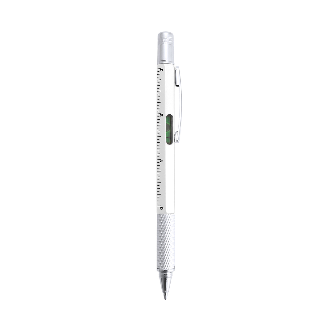 4-in-1 Multifunktions-Dreh-Kugelschreiber in verschiedenen Farben. Mit weichem Griff und integrierter Wasserwaage sowie Lineal mit Skala in Zentimetern und Zoll und Doppelkopf-Schraubendreher - schlitz- und kreuzförmig. Mit Metallclip und blauer Tinte.