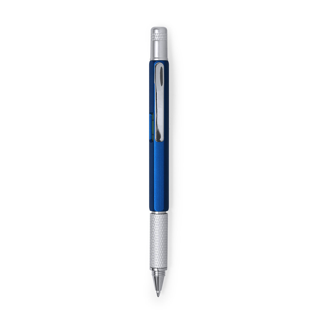 4-in-1 Multifunktions-Dreh-Kugelschreiber in verschiedenen Farben. Mit weichem Griff und integrierter Wasserwaage sowie Lineal mit Skala in Zentimetern und Zoll und Doppelkopf-Schraubendreher - schlitz- und kreuzförmig. Mit Metallclip und blauer Tinte.