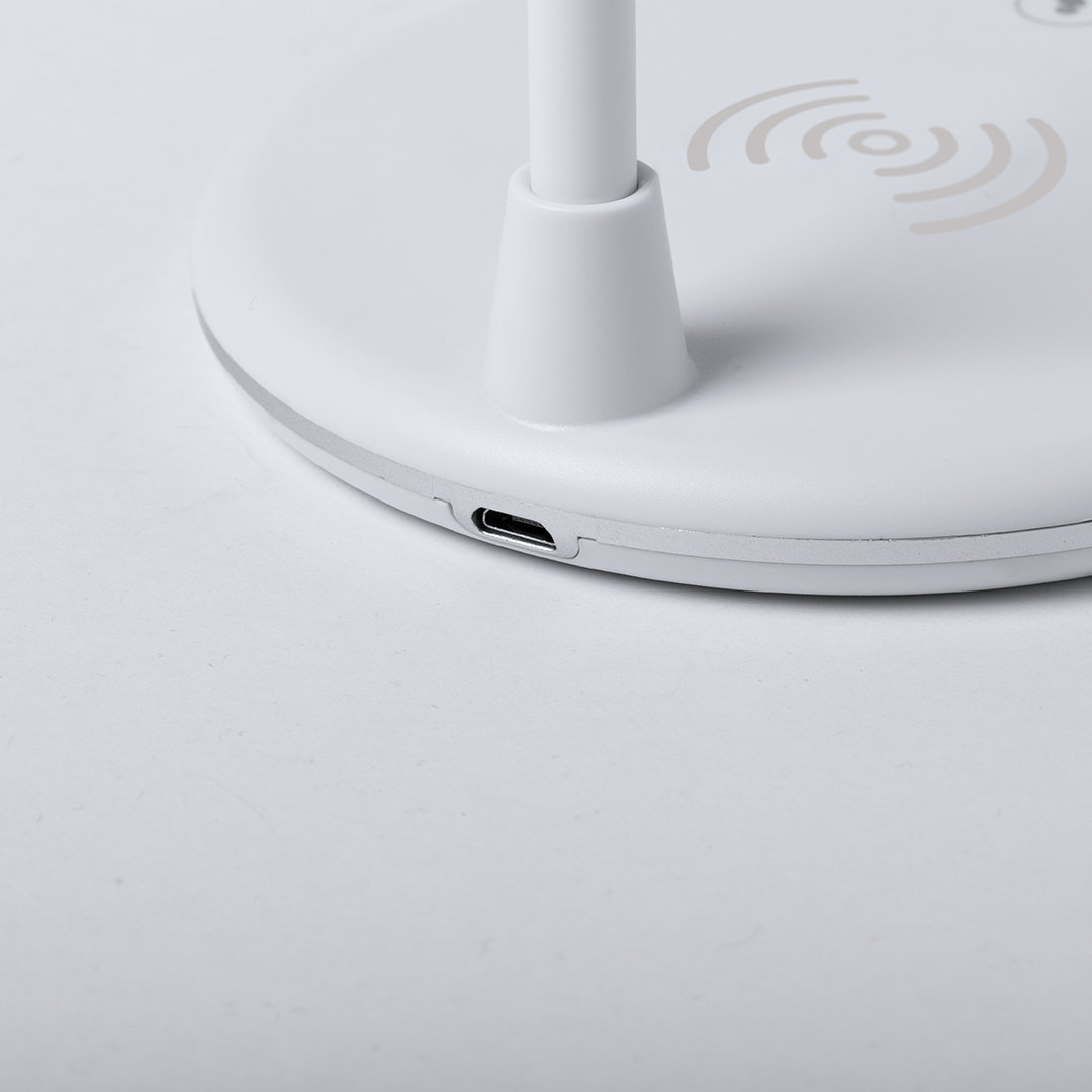 Multifunktionelle All-in-One-Lampe in weißer Ausführung. Mit integriertem Bluetooth®-Lautsprecher und kabelloser Ladestation. 14 LED-Leuchten und 3 Beleuchtungspositionen (warm, kalt und mittel), höhenverstellbar. Kompatibel mit Geräten mit kabelloser Ladetechnologie, mit Micro-USB-Ladekabel und präsentiert in einer attraktiven Designbox.