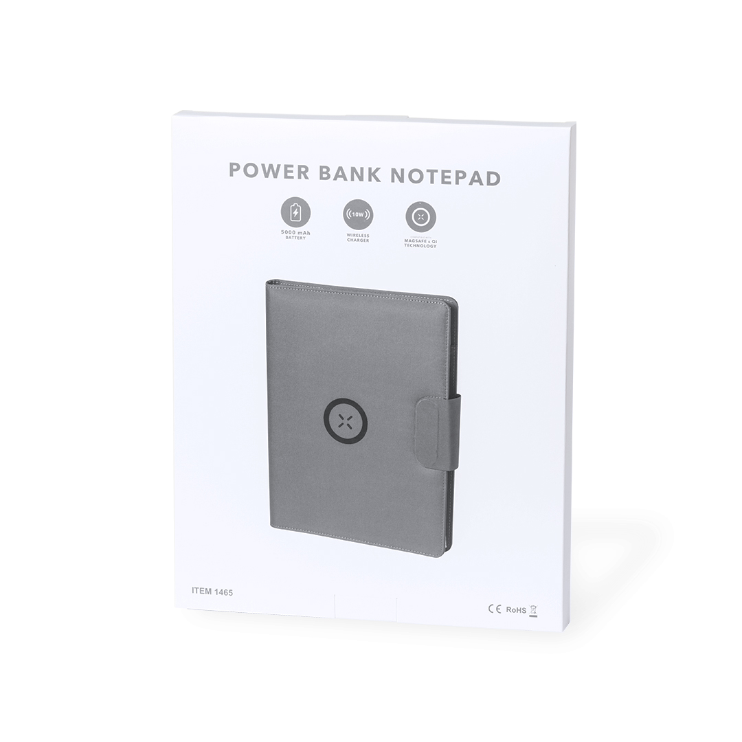 Drahtlos Ladegerät 10W. Power Bank 5000 mAh. USB Ausgang. Micro USB Eingang. 20 Blätter Notizblock