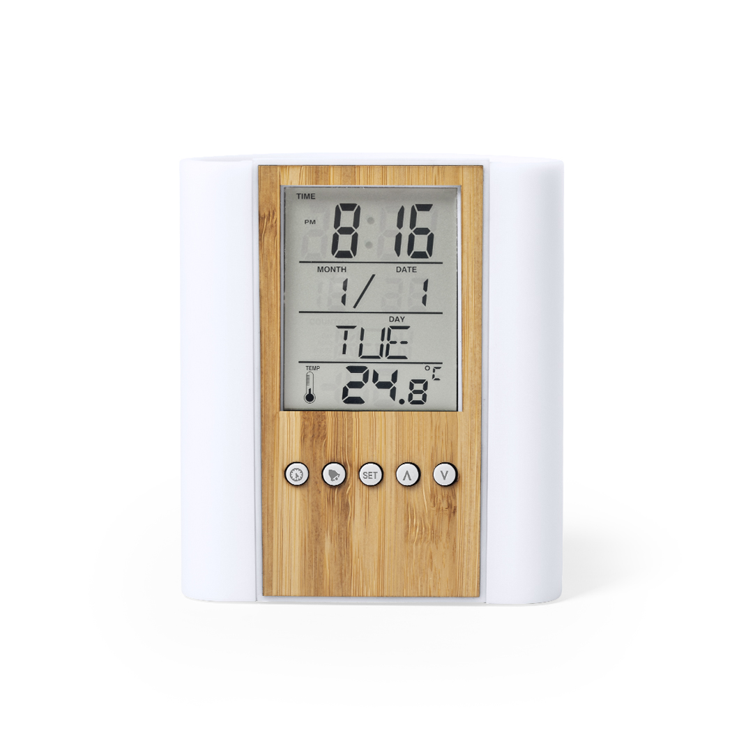 Nature Line Stift mit integrierter Multifunktionsuhr. Hergestellt aus einer Kombination von Bambus- und ABS-Materialien. Funktionen Thermometer, Kalender und Alarm, Timer und Geburtstagserinnerung. Batteriebetrieben (Knopfbatterien im Lieferumfang enthalten) und präsentiert in einer attraktiven Öko-Design-Box. Gebrauchsanweisung in Englisch und Spanisch verfügbar.