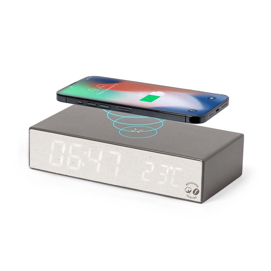 Multifunktionsuhr mit integriertem kabellosen 10-W-Ladegerät. Hergestellt aus Kaffeefasern und recycelter Baumwolle. Zeitfunktion (12/24h), Alarm, mit einstellbarer Lichtintensität. Stromversorgung über USB-Anschluss. Kompatibel mit Geräten, die mit kabelloser Ladetechnologie ausgestattet sind, und präsentiert in einer attraktiven Kraft-Design-Box. Mit Abzeichen aus Kaffeefasern und recycelter Baumwolle. Inklusive Bedienungsanleitung in Englisch und Spanisch. Kaffeefasern sind eine kreislauffähige Lösung, die durch die Verwendung von Abfällen aus der Kaffeeproduktion entsteht. Eine nachhaltige Alternative, die den Einsatz von Kunststoffen reduziert, Energie im Herstellungsprozess spart und zum Umweltschutz beiträgt. Es gibt eine GRS-Zertifizierung (Global Recycled Standard), die die recycelte Herkunft des für die Herstellung des Produkts verwendeten Materials garantiert.