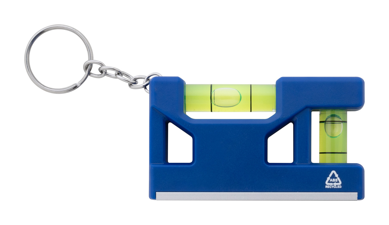 Multifunktionaler Schlüsselanhänger aus recyceltem ABS mit Metallring, Lineal, Magnet und zwei Wasserwaagen.