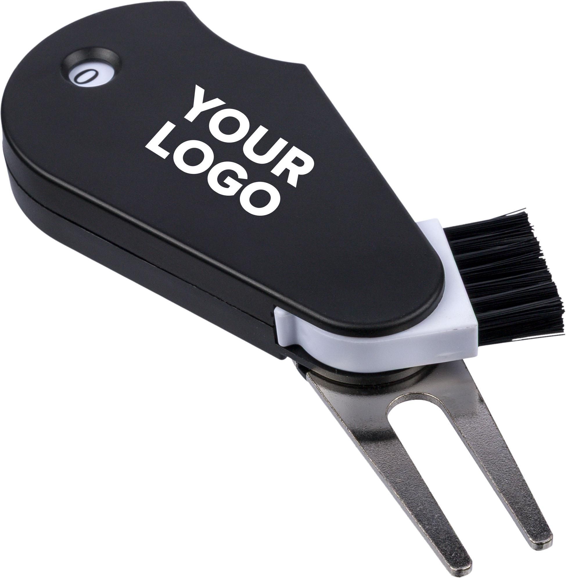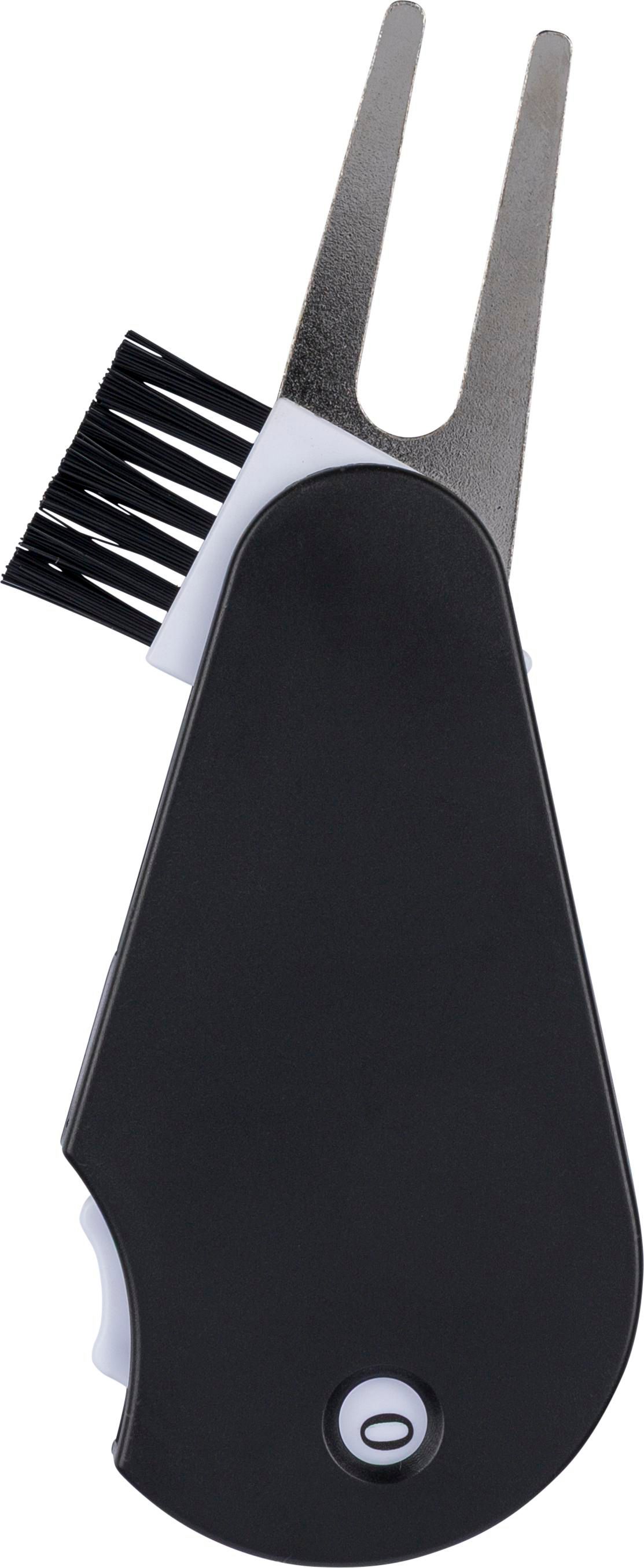 Multifunktionales Golf-Tool aus recyceltem ABS mit integriertem Marker, Pitchgabel, Reinigungsbürste und Punktezähler. Mit Recycling-ABS-Logo auf der Rückseite. Verpackt in einem recycelten Polybeutel.