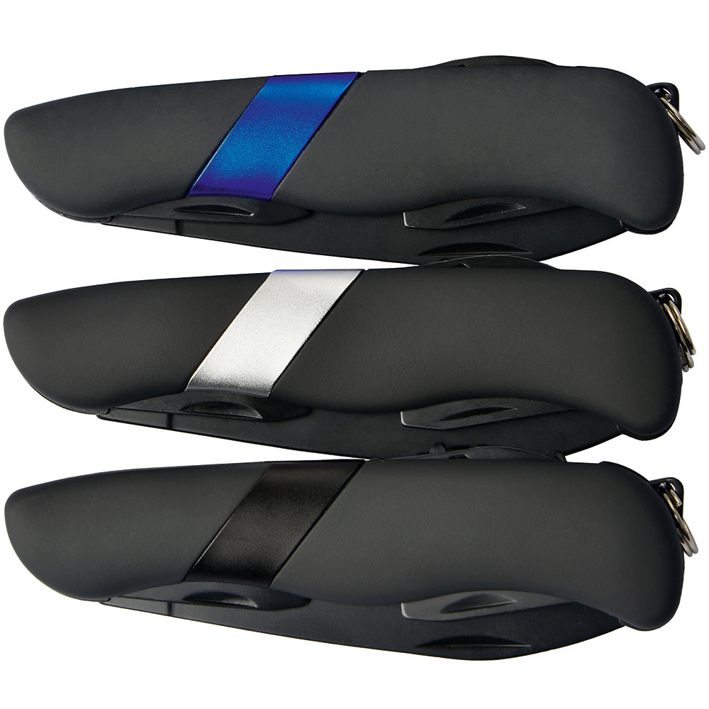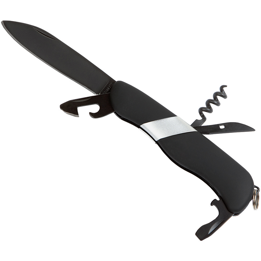 Multifunktions-Taschenmesser mit 7 Funktionen. Vielseitig einsetzbar durch viele nützliche Werkzeuge. Dank der kompakten Größe, passt das Taschenmesser in jede Tasche. Für Rechts- und Linkshänder geeignet. Material: ABS Griffschale mit gummierter Oberfläche und eloxierten Aluminium-Dekoreinlagen. Klinge: 2Cr13 Edelstahl schwarz beschichtet, Klingenlänge 80 mm. Werkzeuge: 2Cr13 Edelstahl schwarz beschichtet. Funktionen: Messer, Dosenöffner, Kronkorken-Heber, Korkenzieher, Stech-Bohr-Nähahle, 2 x Schlitz-Schraubendreher, Schlüsselring zum Befestigen. Verpackung: hochwertige Karton-Geschenkverpackung.