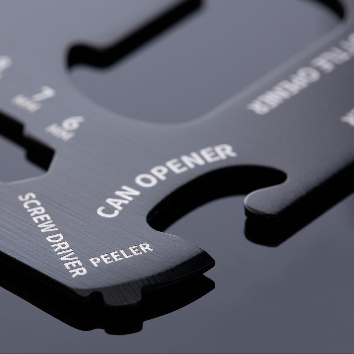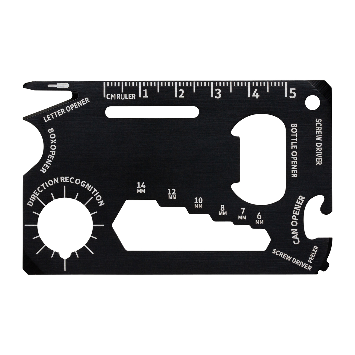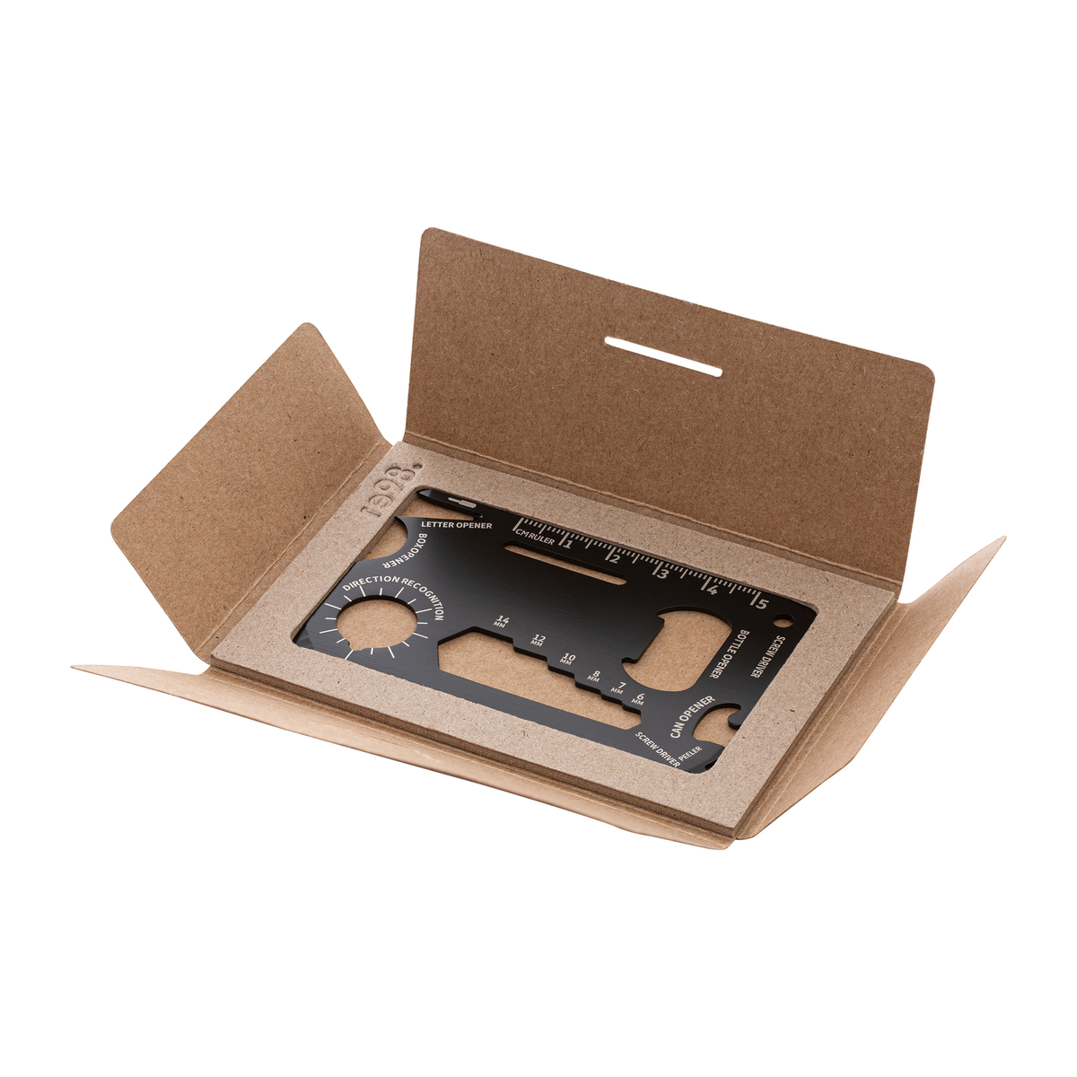 Dieses praktische Werkzeug in Kreditkartengröße zeichnet sich durch die vielseitigen Funktionen und das handliche Format aus. Dank dieser Form passt es problemlos in Portmonee, Hosentasche oder Rucksack. So ist das Werkzeug ein optimaler Begleiter für unterwegs und Outdoor-Aktivitäten. Das Multitool ist aus hochwertigem, schwarz lackiertem Edelstahl gefertigt. 8 Funktionen stehen zur Verfügung: Flaschenöffner, Dosenöffner, Lineal, Schraubendreher, Sechskantschlüssel, Winkelmesser, Paketöffner und Flügelmutter-Dreher. Mit diesem Multitalent ist man für jede alltägliche Eventualität bestens gerüstet. Werbeanbringung erfolgt per Lasergravur oder UV-Druck auf dem Card-Tool. Der Artikel wird in einer hochwertigen Pappbox geliefert.