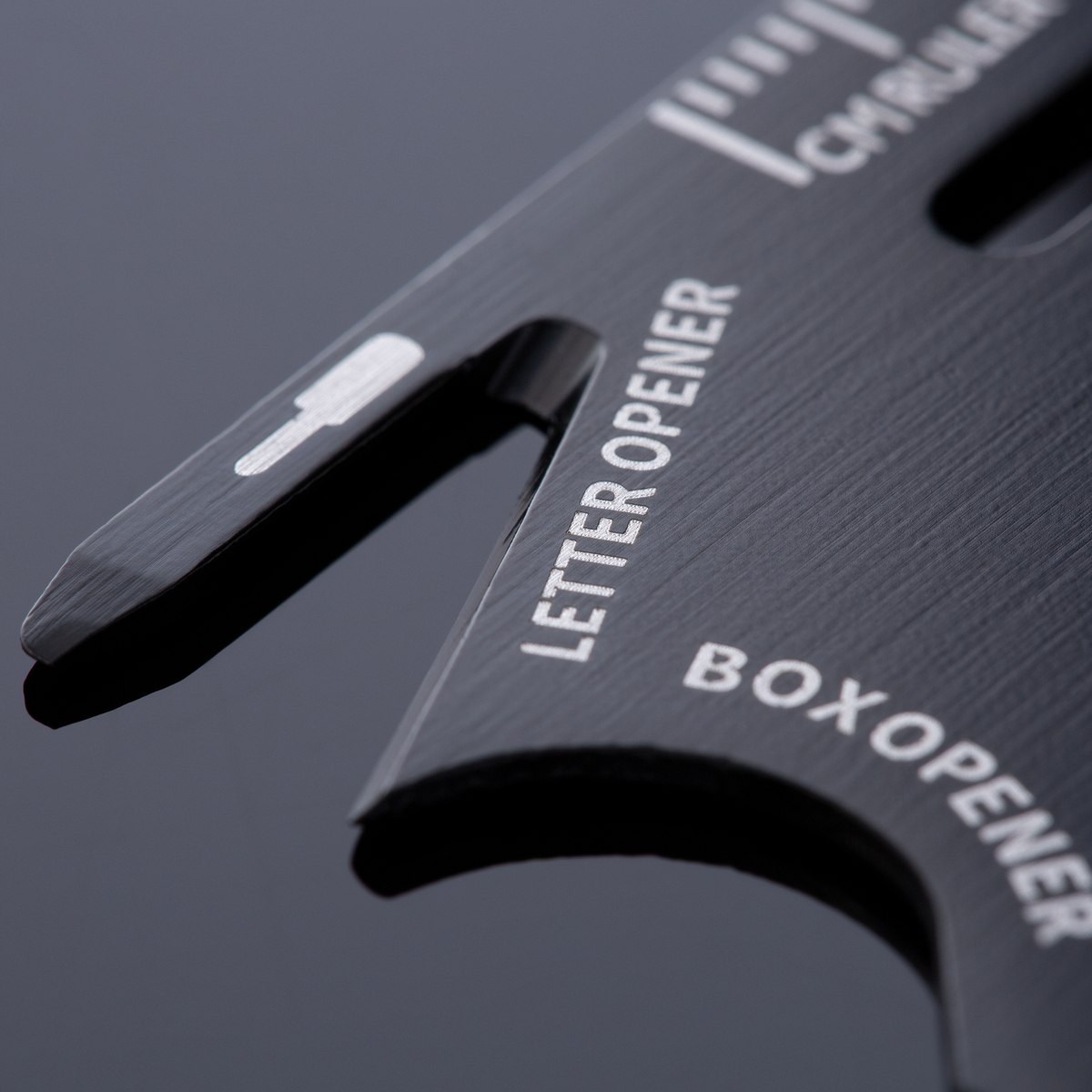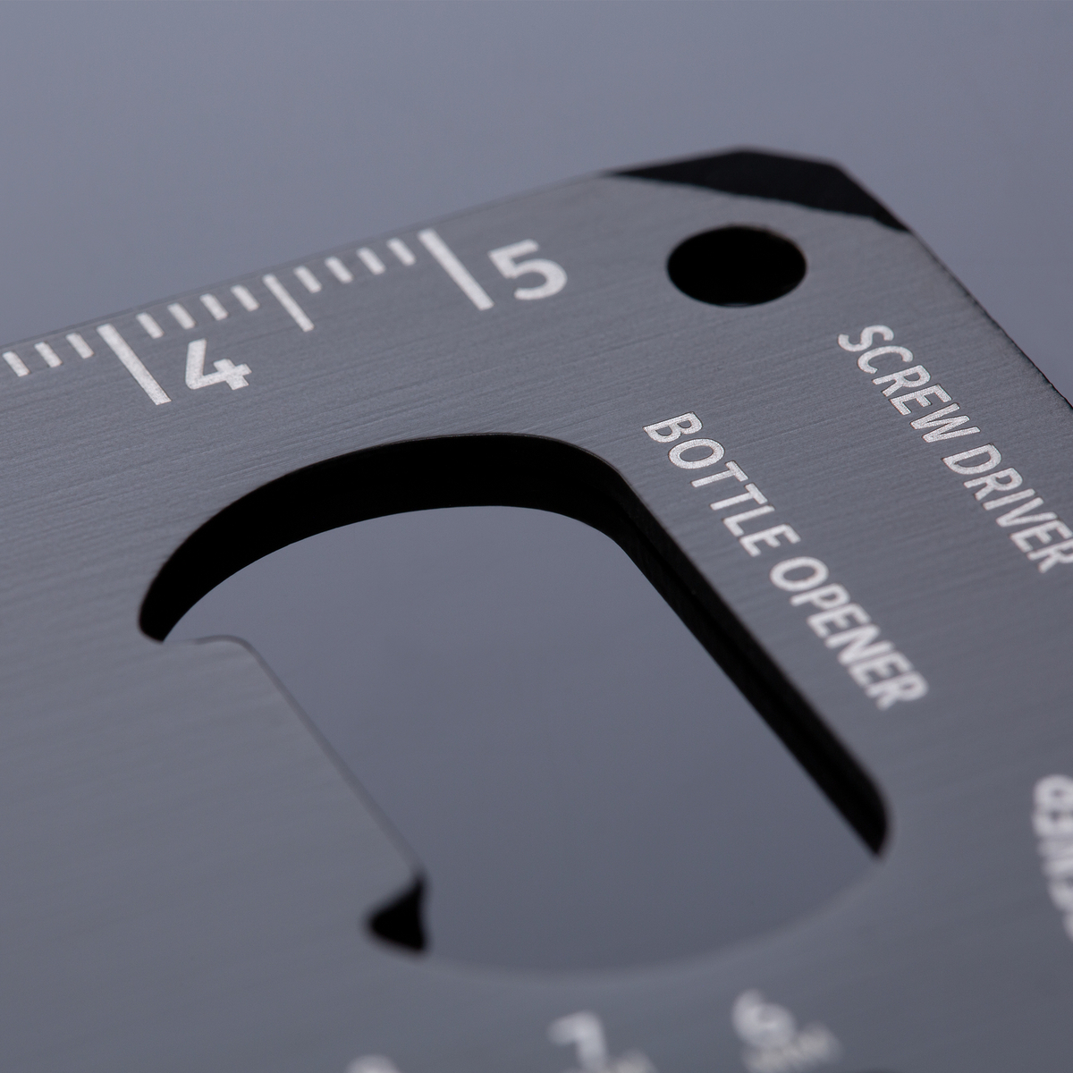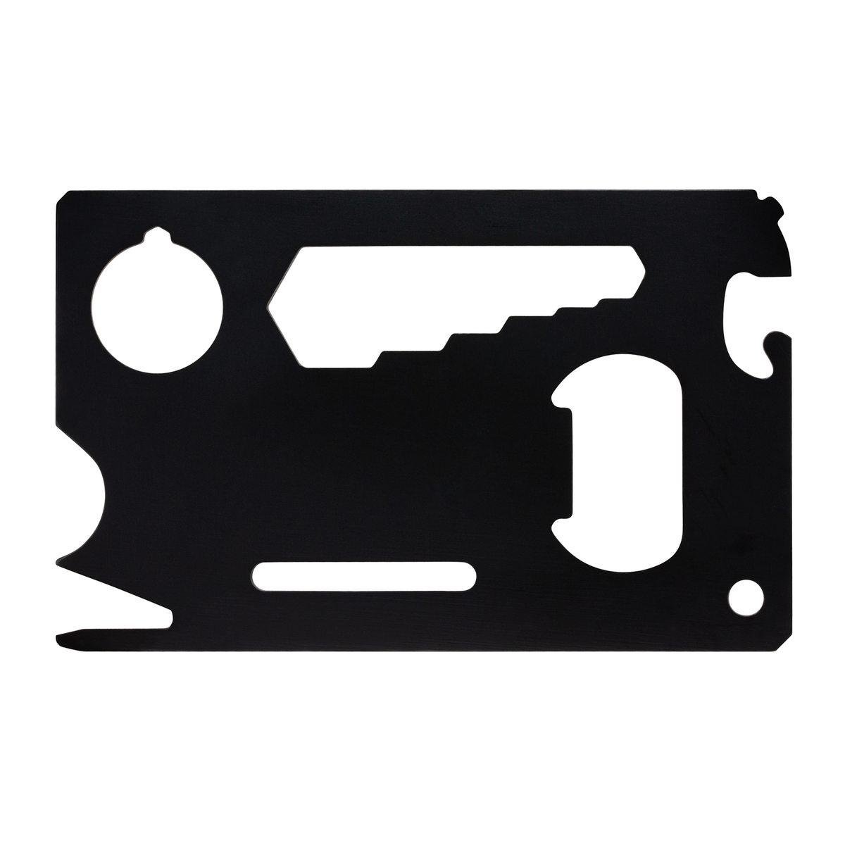 Dieses praktische Werkzeug in Kreditkartengröße zeichnet sich durch die vielseitigen Funktionen und das handliche Format aus. Dank dieser Form passt es problemlos in Portmonee, Hosentasche oder Rucksack. So ist das Werkzeug ein optimaler Begleiter für unterwegs und Outdoor-Aktivitäten. Das Multitool ist aus hochwertigem, schwarz lackiertem Edelstahl gefertigt. 8 Funktionen stehen zur Verfügung: Flaschenöffner, Dosenöffner, Lineal, Schraubendreher, Sechskantschlüssel, Winkelmesser, Paketöffner und Flügelmutter-Dreher. Mit diesem Multitalent ist man für jede alltägliche Eventualität bestens gerüstet. Werbeanbringung erfolgt per Lasergravur oder UV-Druck auf dem Card-Tool. Der Artikel wird in einer hochwertigen Pappbox geliefert.